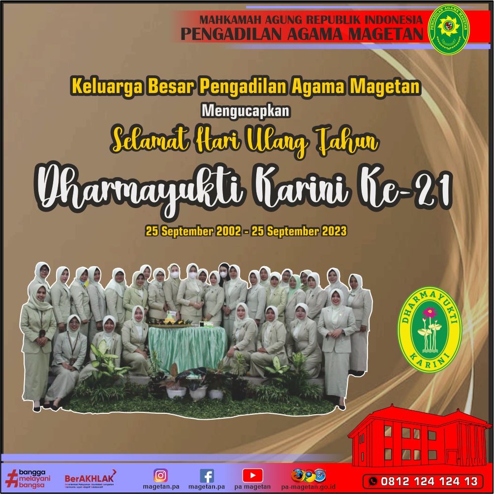 Selamat Hari Ulang Tahun Dharmayukti Karini Ke-21 Written by Admin on 26 September 2023. Written by Admin on 26 September 2023. Hits: 649