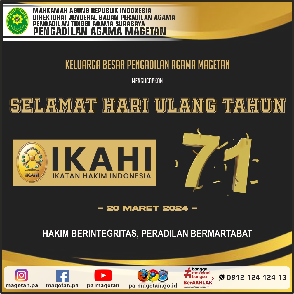 Selamat HUT IKAHI (Ikatan Hakim Indonesia) KE-71 Written by Admin on 20 March 2024. Written by Admin on 20 March 2024. Hits: 680