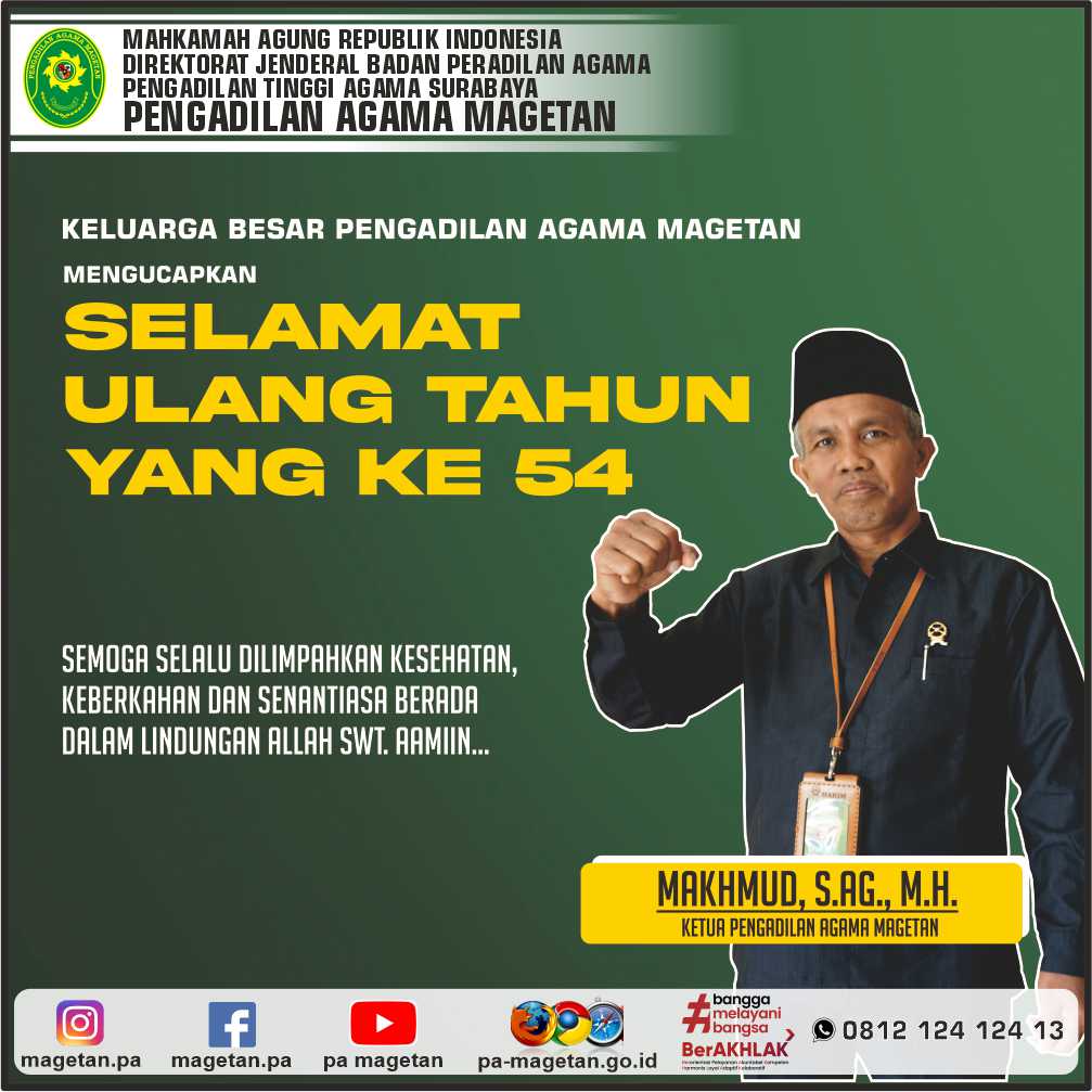 Selamat Ulang Tahun Yang Ke 54 Makhmud, S.Ag., M.H. Written by Admin on 08 May 2024. Written by Admin on 08 May 2024. Hits: 611