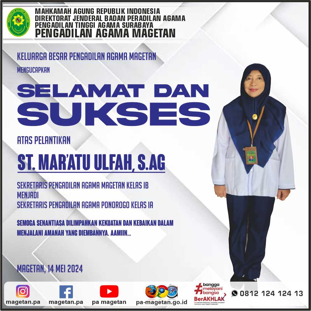 Selamat & Sukses Atas Dilantiknya Ibu. St. Mar’atu Ulfah, S.Ag Written by Admin on 14 May 2024. Written by Admin on 14 May 2024. Hits: 610