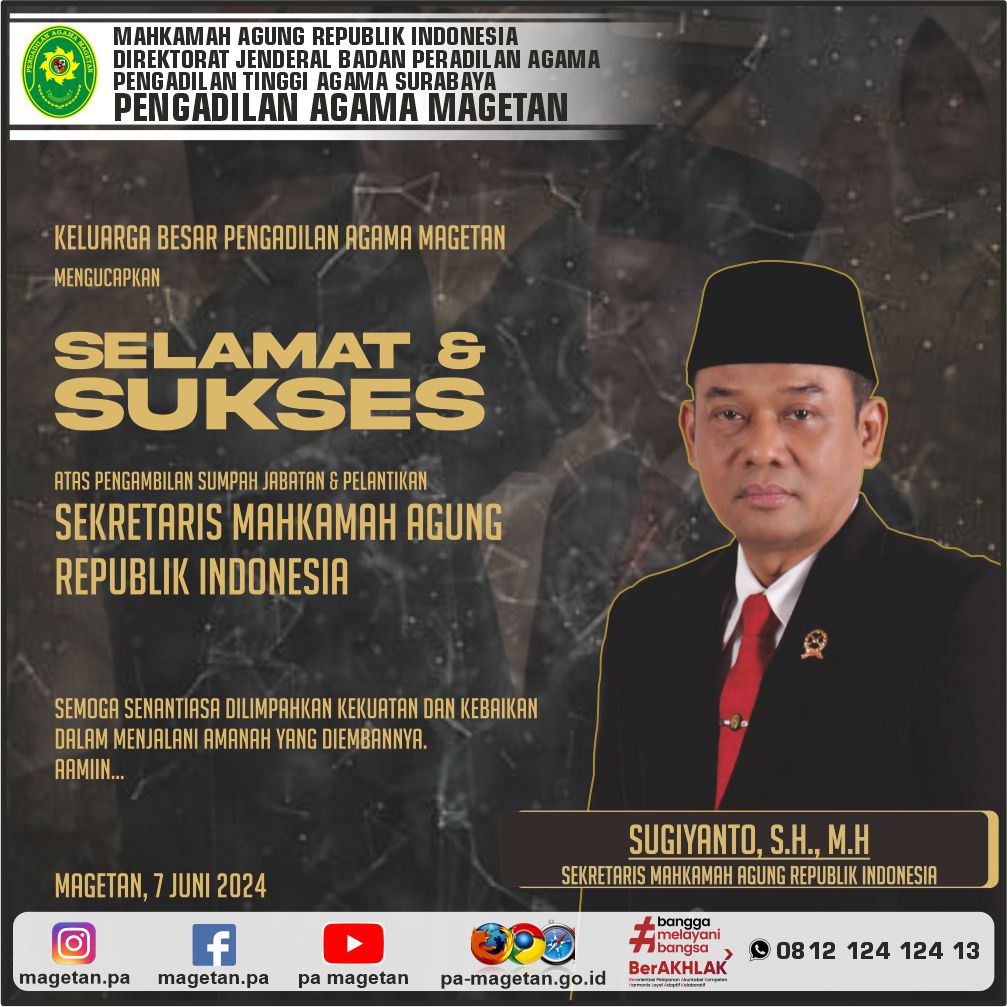 Selamat & Sukses Sekretaris Mahkamah Agung RI (Sugiyanto, S.H, M.H) Written by Admin on 07 June 2024. Written by Admin on 07 June 2024. Hits: 578