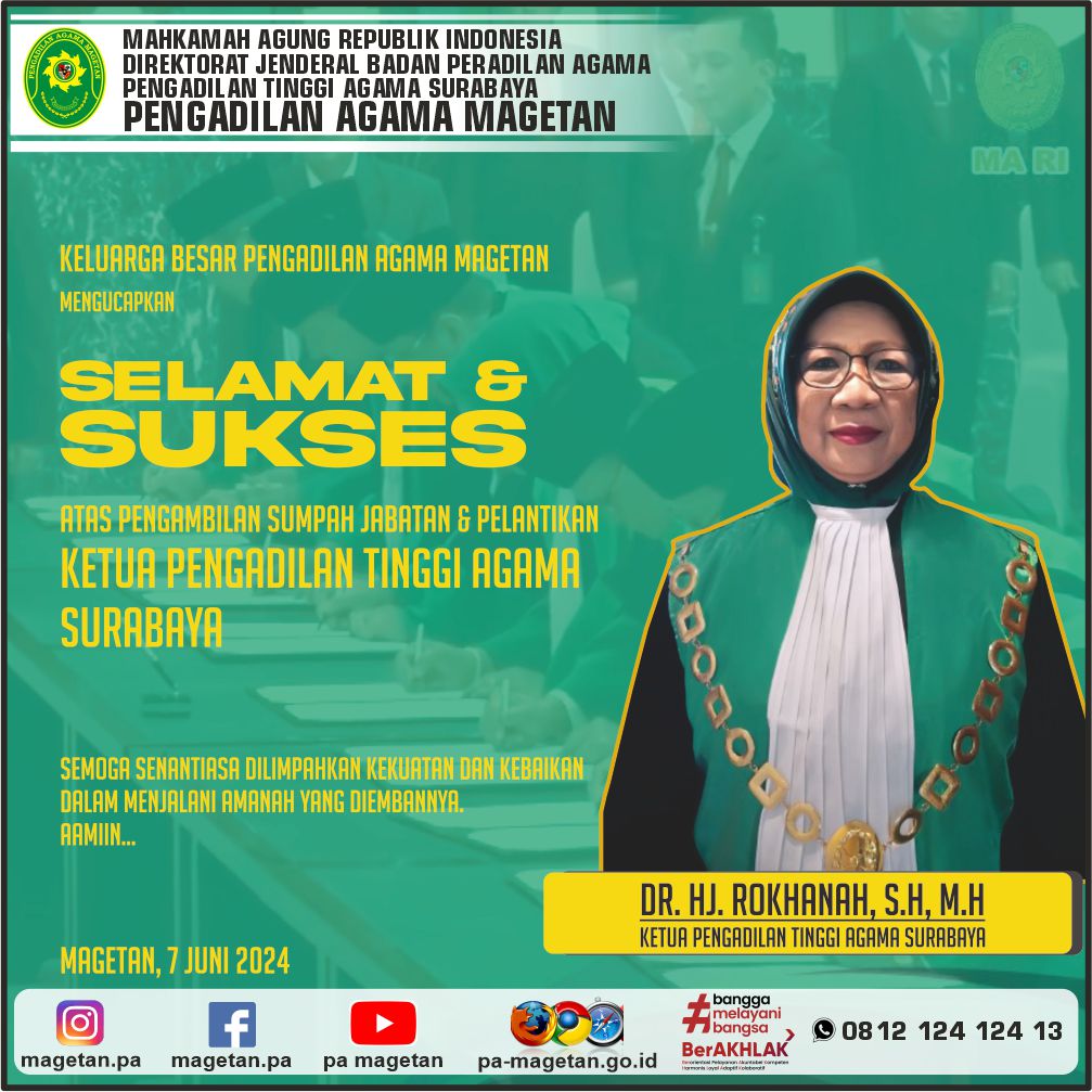 Selamat & Sukses Ketua Pengadilan Tinggi Agama Surabaya (Dr. Hj. Rokhanah, S.H, M.H) Written by Admin on 07 June 2024. Written by Admin on 07 June 2024. Hits: 1102