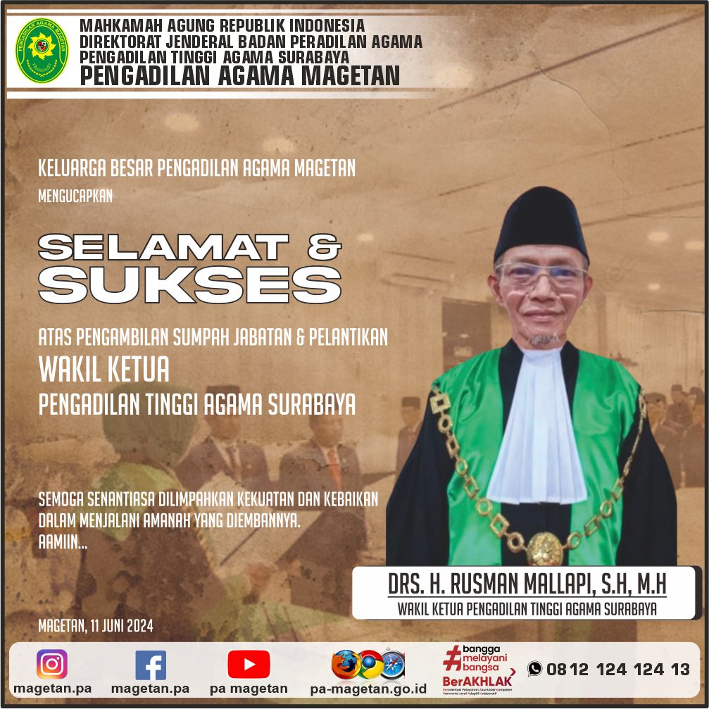 Selamat & Sukses Wakil Ketua Pengadilan Tinggi Agama Surabaya (Drs. H. Rusman Mallapi, S.H, M.H) Written by Admin on 11 June 2024. Written by Admin on 11 June 2024. Hits: 691