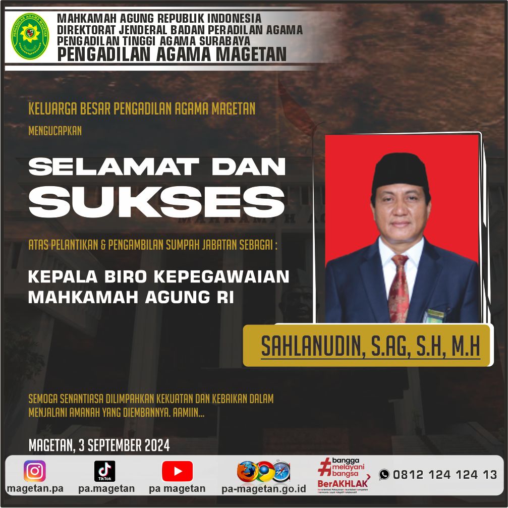Selamat & Sukses Bp. Sahlanudin, S.Ag., S.H, M.H. Written by Admin on 03 September 2024. Written by Admin on 03 September 2024. Hits: 639