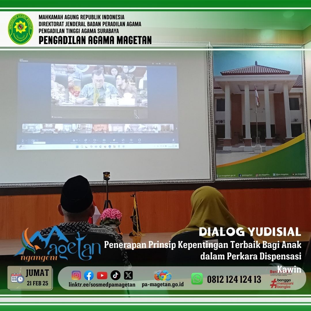 Magetan | pa-magetan.go.id | Pengadilan Agama Magetan mengikuti Dialog Yudisial " Penerapan Prinsip Kepentingan Terbaik Bagi Anak Dalam Perkara Dispensasi Kawin " yang diselenggarakan oleh Direktorat Jenderal Badan