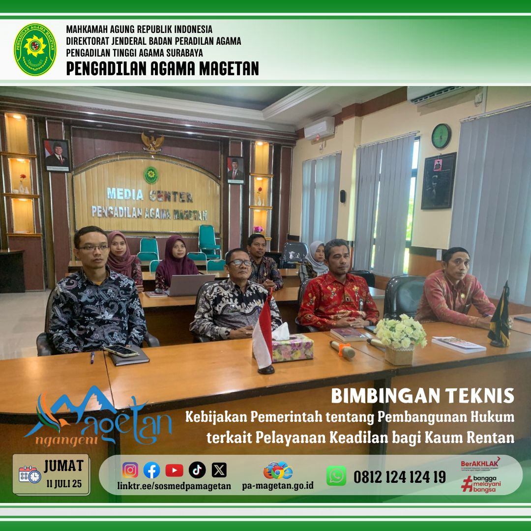 Magetan | pa-magetan.go.id | PA Magetan ikuti Bimtek Pelayanan Hukum Bagi Kaum Rentan. Bertempat di Ruang Media Center, Wakil Ketua Pengadilan Agama Magetan, Bapak Huda Lukoni, S.H.I., S.H., M.H., bersama para hakim mengikuti kegiatan Bimbingan Teknis secara daring pada Jumat (11/7/25) pukul 08.00 WIB. Kegiatan ini dilaksanakan secara online yang bekerja sama dengan Bappenas. Tema yang diangkat adalah “Kebijakan Pemerintah tentang Pembangunan Hukum terkait Pelayanan Keadilan bagi Kaum Rentan.” Acara ini dihadiri oleh peserta dari berbagai satuan kerja di seluruh Indonesia.