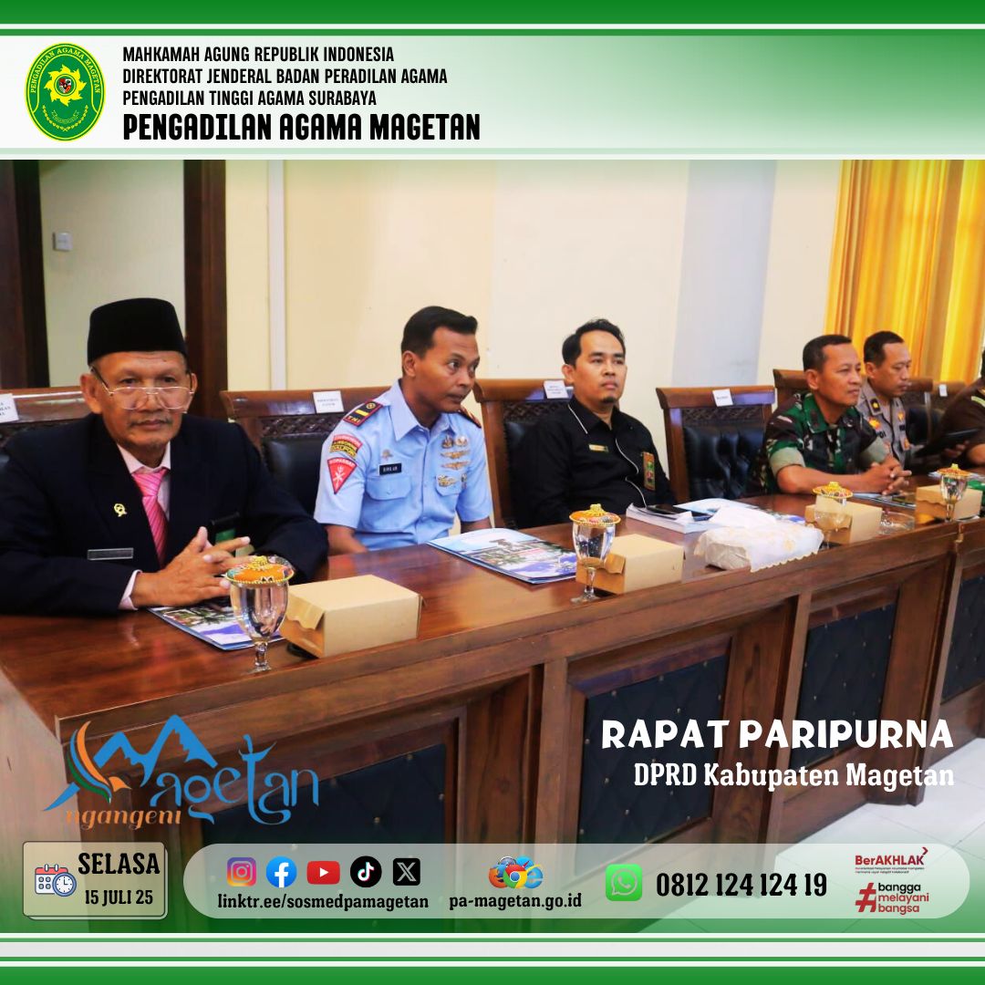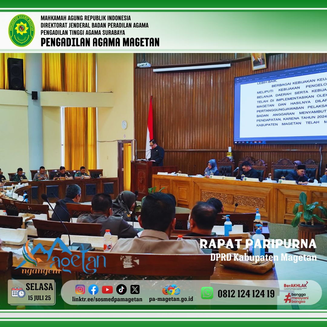 Magetan | pa-magetan.go.id |Selasa (15/7/25) Bertempat di ruang rapat paripurna gedung DPRD Magetan, Pengadilan Agama Magetan mengikuti kegiatan pengambilan keputusan terhadap Rancangan Peraturan Daerah (Raperda) Pertanggungjawaban Pelaksanaan APBD Tahun Anggaran 2024. Kegiatan ini dihadiri oleh Bupati Magetan beserta Wakil Bupati Magetan, Forkopimda, OPD, fraksi dari partai. Pengadilan Agama Magetan pada kegiatan ini diwakili oleh Hakim Pengadilan Agama Magetan, Dr.Drs. Sugeng., M.Hum.