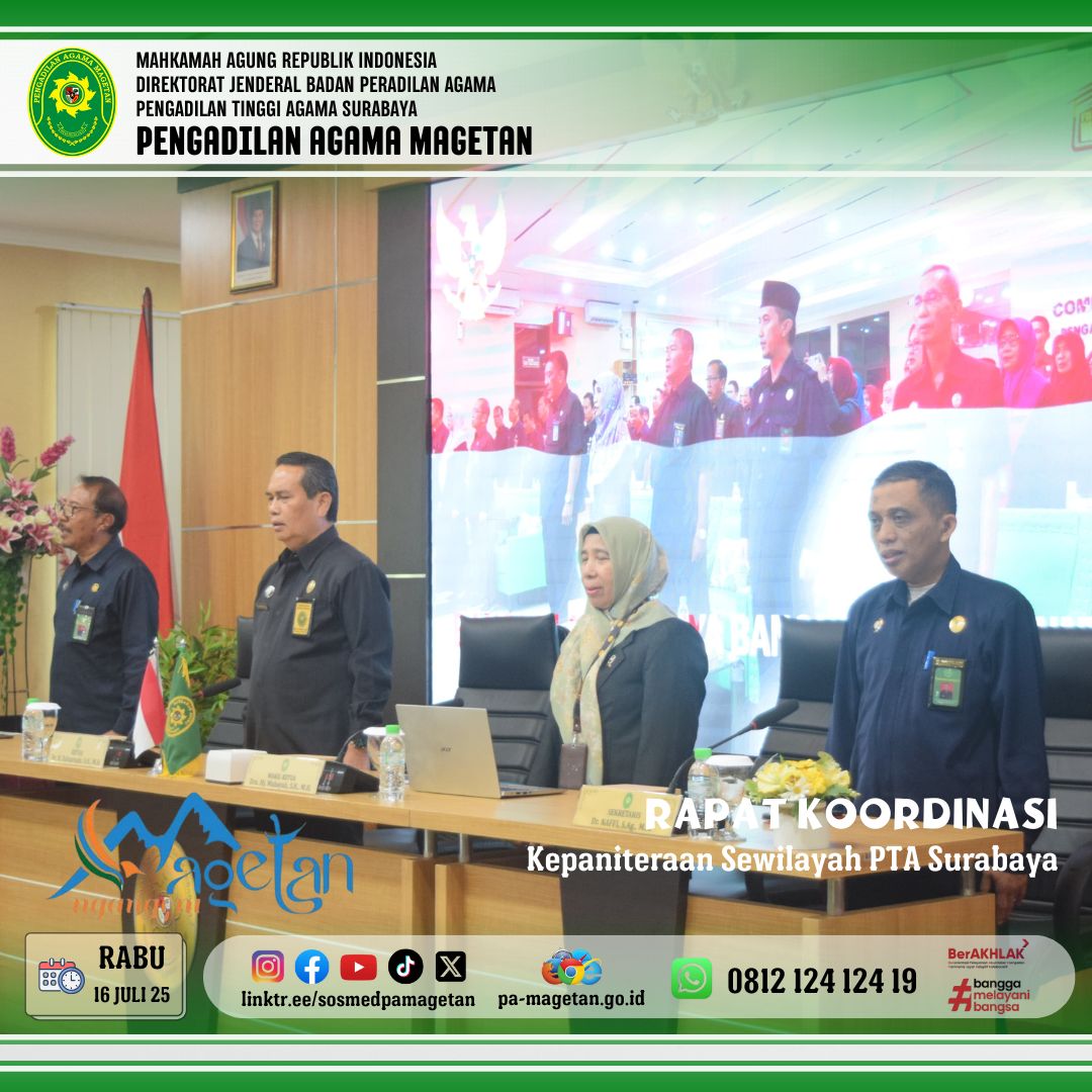 Magetan | pa-magetan.go.id |Pengadilan Tinggi Agama (PTA) Surabaya baru saja menyelenggarakan rapat koordinasi penting guna membahas peningkatan kompetensi Sumber Daya Manusia (SDM) dibagian kepaniteraan di seluruh wilayah hukumnya pada hari Rabu (16/07/2025). Rapat ini dihadiri oleh para Panitera (Hj,Nilna Niamatin, S.Ag.,M.H), Panitera Pengganti (Rahmad Pujiraharja S.H ), (Hj.Siti Marfu’ah S.H) dan Para Panitera Muda dari Seluruh Jawa Timur. Tema Kegiatan ini adalah “Kode Etik dan Pedoman Perilaku Panitera dan Jurusita”. Kegiatan ini betujuan untuk menunjukkan komitmen bersama untuk mencapai keunggulan untuk mengembangkan kompetensi dan profesionalisme staf kepaniteraan, mengingat peran mereka dalam mendukung sistem peradilan yang efektif.