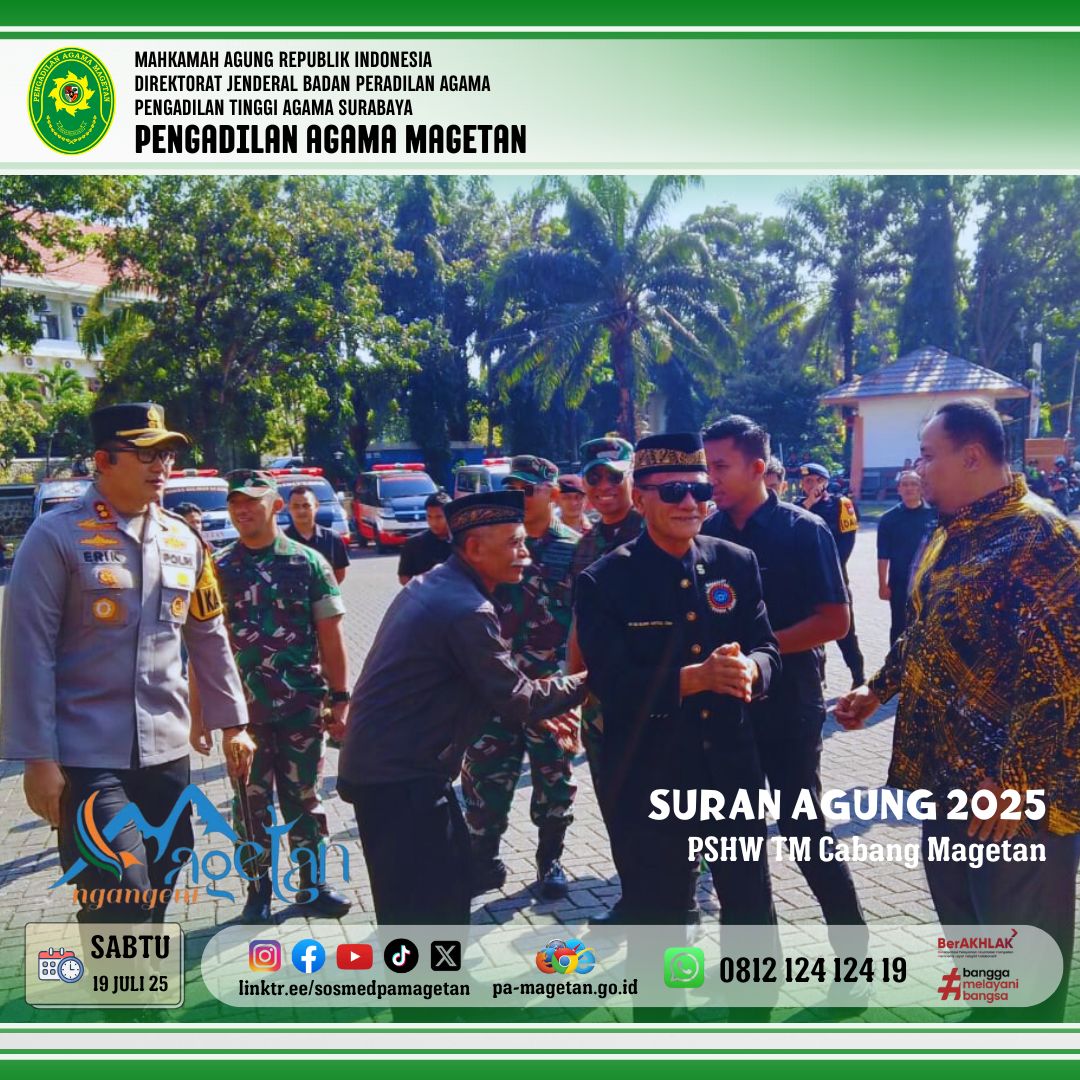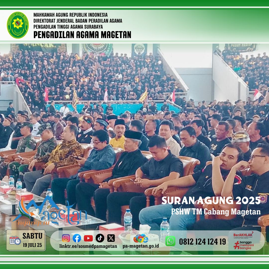 Magetan | pa-magetan.go.id | Suran Agung 2025 yang diselenggarakan oleh Persaudaraan Setia Hati Winongo Tunas Muda (PSHWTM) Cabang Magetan pada Sabtu (19/7/25) bertempat di GOR Ki Mageti. Pengadilan Agama Magetan yang diwakili oleh Bapak Antoni Windika, S.H. hadir dalam kegiatan yang berlangsung pada pagi hari tersebut. Selain itu, kegiatan tersebut juga dihadiri oleh Forkopimda Kabupaten Magetan. Kegiatan tersebut dilaksanakan dalam rangka memperingati Ulang Tahun Persaudaraan Setia Hati Winongo Tunas Muda (PSHWTM) yang ke-122 dan untuk menjalin silaturahmi terhadap seluruh saudara seasuhan.