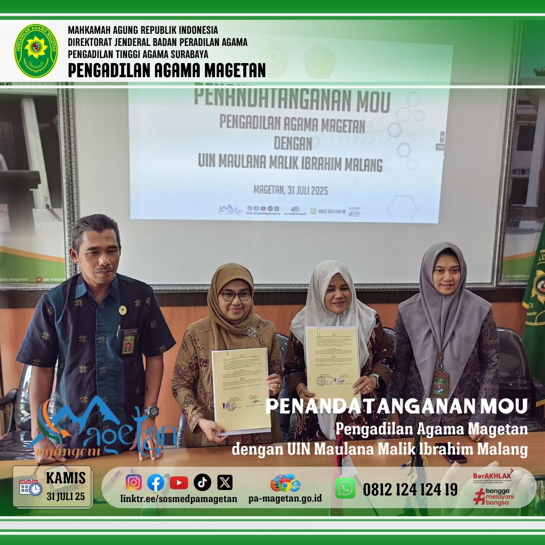 Magetan | pa-magetan.go.id | Pada hari Kamis (31/07/2025)Pengadilan Agama Magetan Jalin Kerja Sama dengan UIN Maulana Malik Ibrahim Malang. Pengadilan Agama Magetan menandatangani nota kesepahaman (MoU) dengan Universitas Islam Negeri Maulana Malik Ibrahim Malang sebagai bentuk sinergi dalam bidang pendidikan, penelitian, dan pengabdian masyarakat. Penandatanganan dilakukan di Kantor Pengadilan Agama Magetan pada Selasa, 30 Juli 2025. Kegiatan ini dihadiri oleh pimpinan dari kedua lembaga serta jajaran pendukung dan mahasiswa. MoU ini menjadi dasar resmi pelaksanaan praktik lapangan dan kerja sama kelembagaan ke depan.