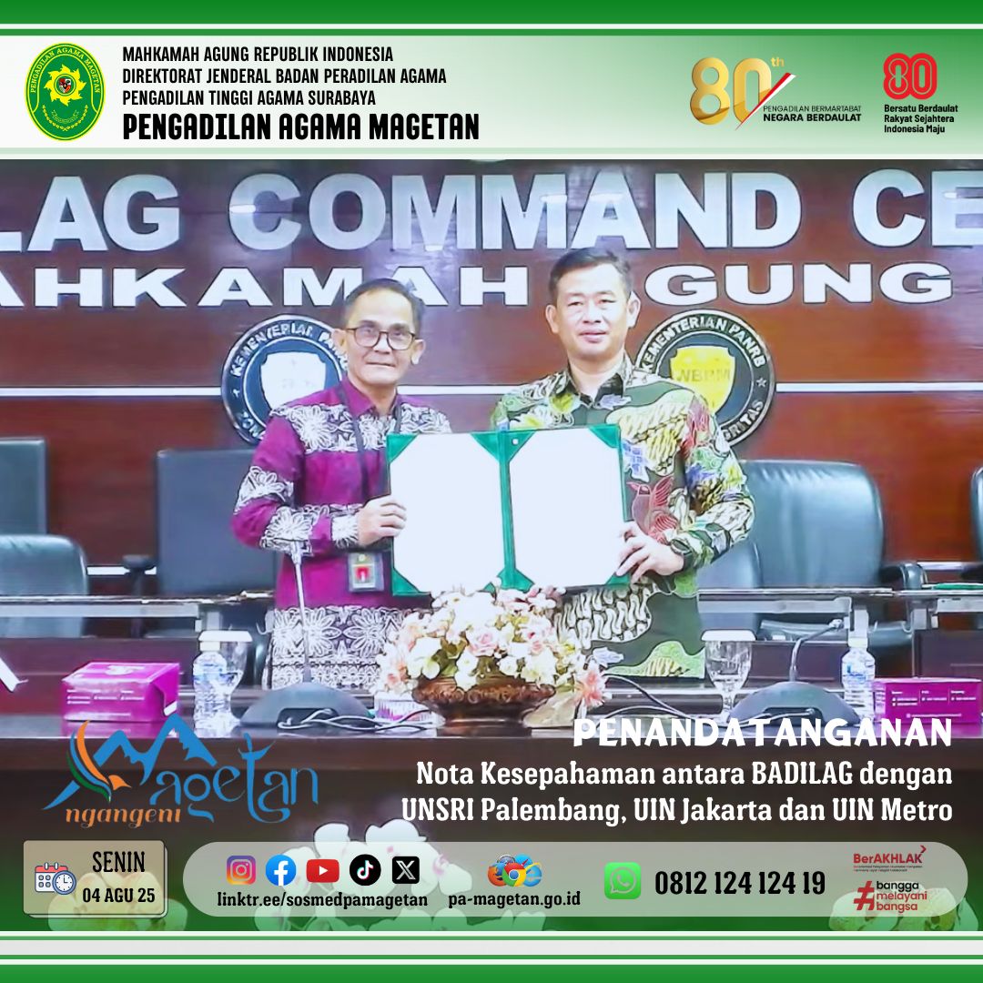 "Kerja sama ini bukan sekadar formalitas, tetapi merupakan langkah strategis untuk mencetak SDM peradilan yang tidak hanya paham hukum, tetapi juga memiliki visi transformasi dan semangat modernisasi,” ujar salah satu pejabat Ditjen Badilag. Kegiatan ini turut dihadiri oleh berbagai perwakilan pengadilan agama di seluruh Indonesia, termasuk dari Pengadilan Agama Magetan. Hadir dalam kegiatan tersebut, Dr. Hermin Sriwulan, S.H.I., S.H., M.H.I., Huda Lukoni, S.H.I., S.H., M.H., dan Hj. Nilna Niamatin, S.Ag., M.H.