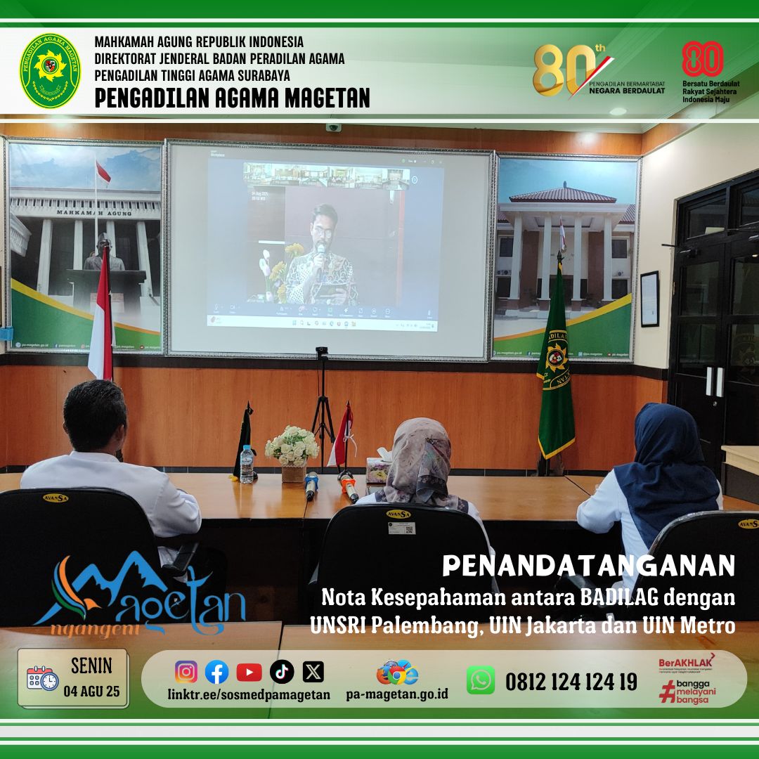 Direktorat Jenderal Badan Peradilan Agama (Ditjen Badilag) Mahkamah Agung Republik Indonesia menyelenggarakan kegiatan Penandatanganan Nota Kesepahaman (MoU) bersama tiga perguruan tinggi ternama, yaitu Universitas Islam Negeri (UIN) Syarif Hidayatullah Jakarta, Universitas Sriwijaya Palembang, dan UIN Raden Intan Jurai Siwo. Kegiatan ini dilanjutkan dengan kuliah umum yang disampaikan oleh Guru Besar Universitas Sriwijaya.