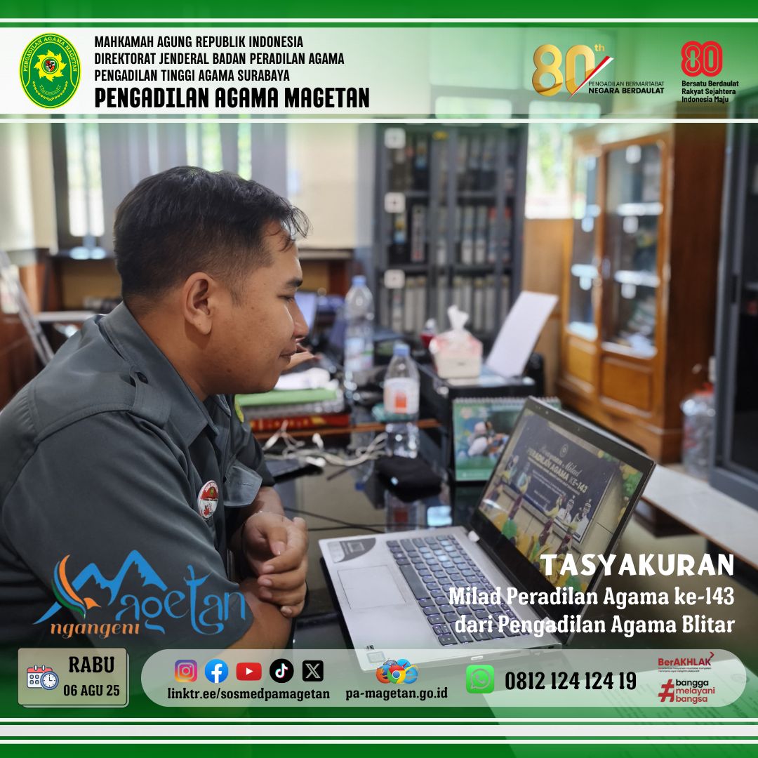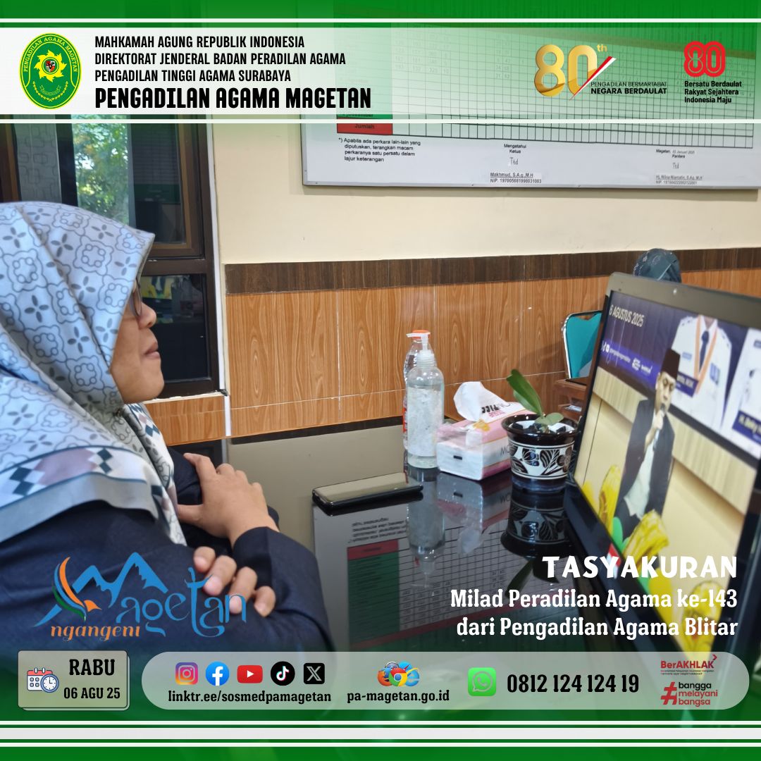 Magetan | pa-magetan.go.id | Rabu (6/8/2025) Dalam rangka memperingati Milad Peradilan Agama yang ke 143, Pengadilan Agama Magetan ikut serta dalam memeriahkan acara tasyakuran yang dilaksanakan oleh Pengadilan Agama Blitar melalui live streaming Youtube. Acara berlangsung khidmat dan penuh kekeluargaan. Kegiatan ini dilaksanakan di ruang Candi Panataran Lt. 3 Kantor Bupati Blitar dan dihadiri oleh Ketua Pengadilan Tinggi Agama (KPTA) Surabaya dan jajarannya, Bupati Blitar dan jajarannya, Walikota Blitar dan jajarannya, Ketua PA Sekarisidenan Kediri, Panitera dan Sekretaris Sekarisidenan Kediri, Forkopimda Kabupaten Blitar, dan seluruh tamu undangan. Acara tasyakuran diawali dengan doa bersama dan pembacaan ayat-ayat suci Al-Quran yang bacakan oleh Ustad Shohib Abidin, sebagai bentuk rasa terima kasih atas bertambahnya usia lembaga Peradilan Agama yang telah memberikan pelayanan hukum kepada masyarakat dengan profesional dan berintegritas.
