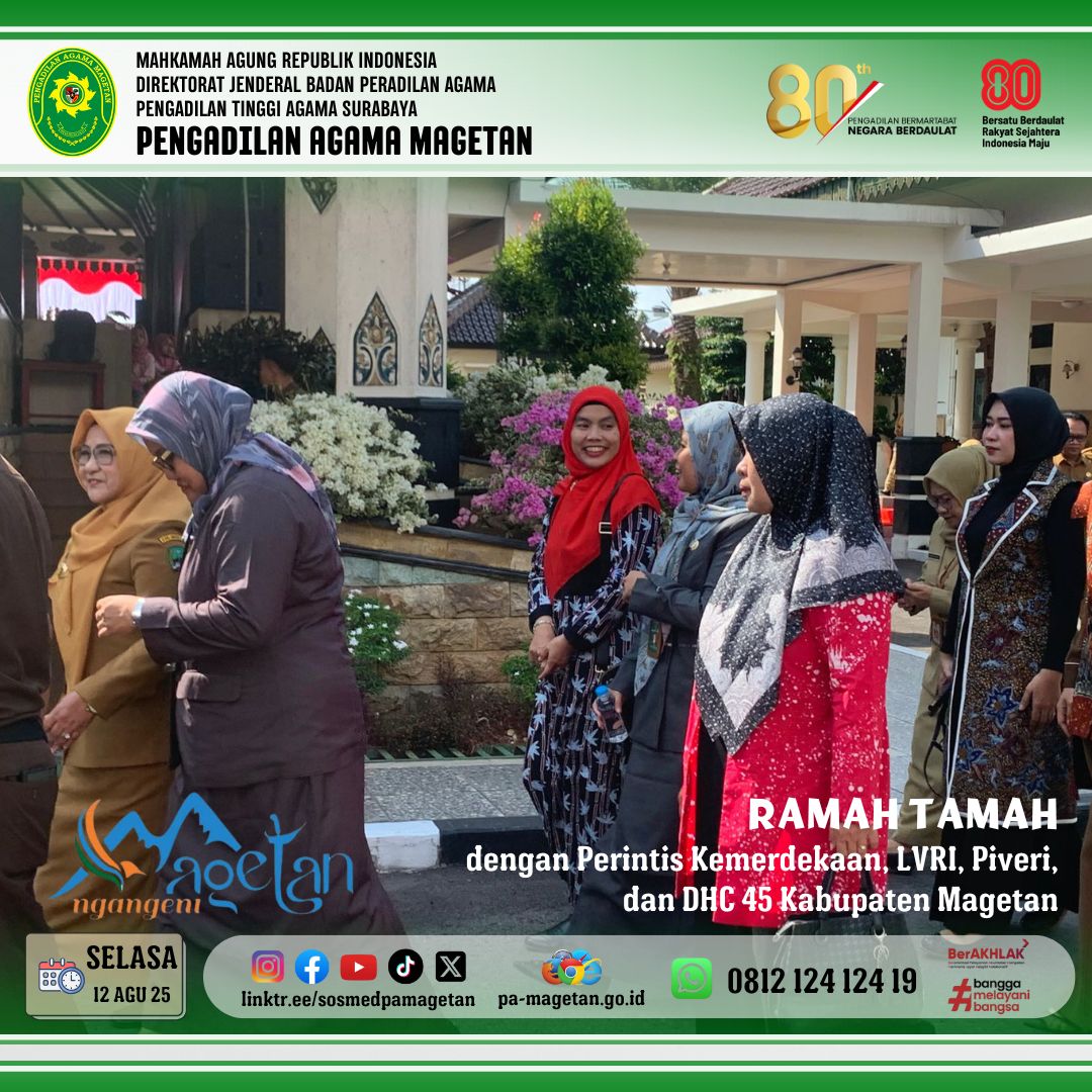 Magetan | pa-magetan.go.id | Selasa (12/8/2025) Pengadilan Agama Magetan menghadiri acara Ramah Tamah dengan para perintis kemerdekaan,LVRI, PIVERI, dan DHC yang bertempat di Pendopo Surya Graha, Magetan. Kegiatan ini dihadiri oleh Bupati Magetan, jajaran TNI-Polri, Pj. Sekda, Asisten, Staf Ahli, OPD terkait, persatuan Wredhatama, dan tokoh penting kemerdekaan. Dalam sambutannya, Ketua LVRI (Legiun Veteran Republik Indonesia) Magetan Sayuti menyampaikan “NKRI, UUD 1945, Bendera Merah Putih, dan Bhinneka Tunggal Ika adalah harga mati yang tidak boleh ditinggalkan.’’ Hal tersebut untuk mengingatkan generasi penerus akan pentingnya menjaga persatuan dan kesatuan bangsa.