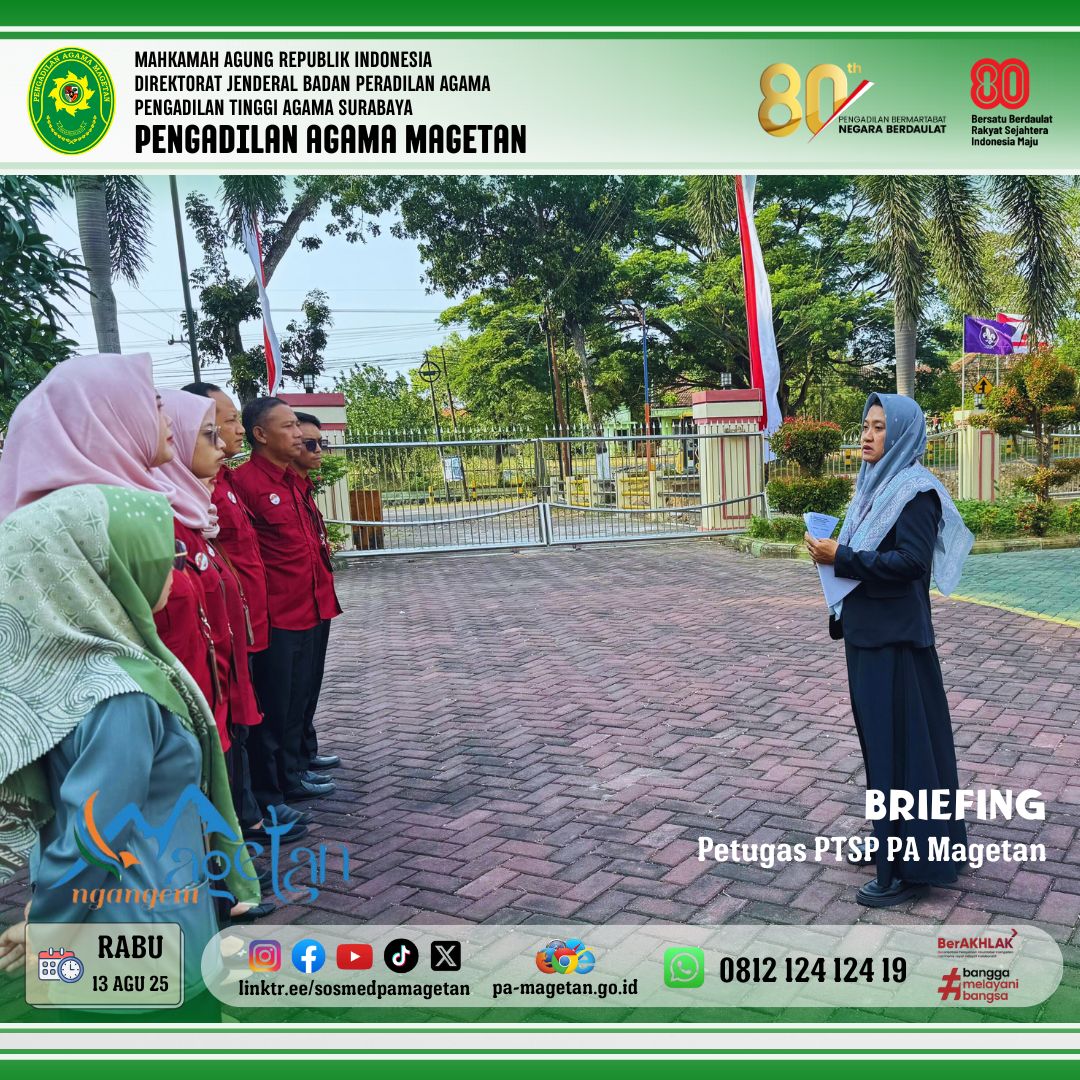 Magetan | pa-magetan.go.id | Pada Rabu (13/08/2025), petugas Pelayanan Terpadu Satu Pintu (PTSP) Pengadilan Agama Magetan mengikuti briefing yang dipimpin langsung oleh Panitera, Ibu Hj. Nilna Niamatin, S.Ag., M.H. Kegiatan ini dilaksanakan setelah melaksanakan Morning Briefing dengan tujuan memberikan arahan dan evaluasi terhadap pelayanan yang telah berjalan. Seluruh petugas PTSP hadir lengkap untuk menyimak instruksi dan saran yang disampaikan. Briefing berlangsung dalam suasana serius namun tetap komunikatif.