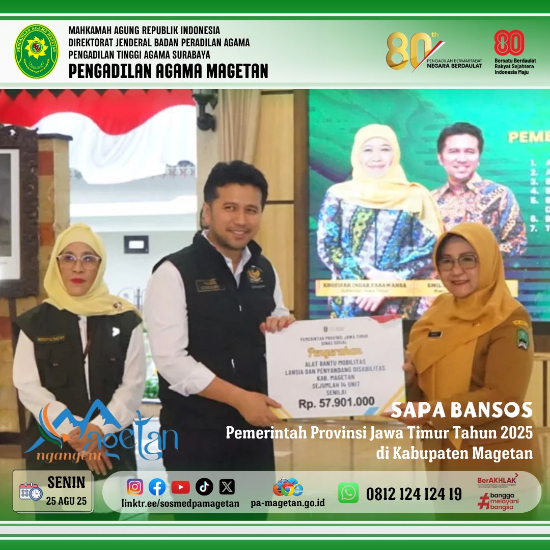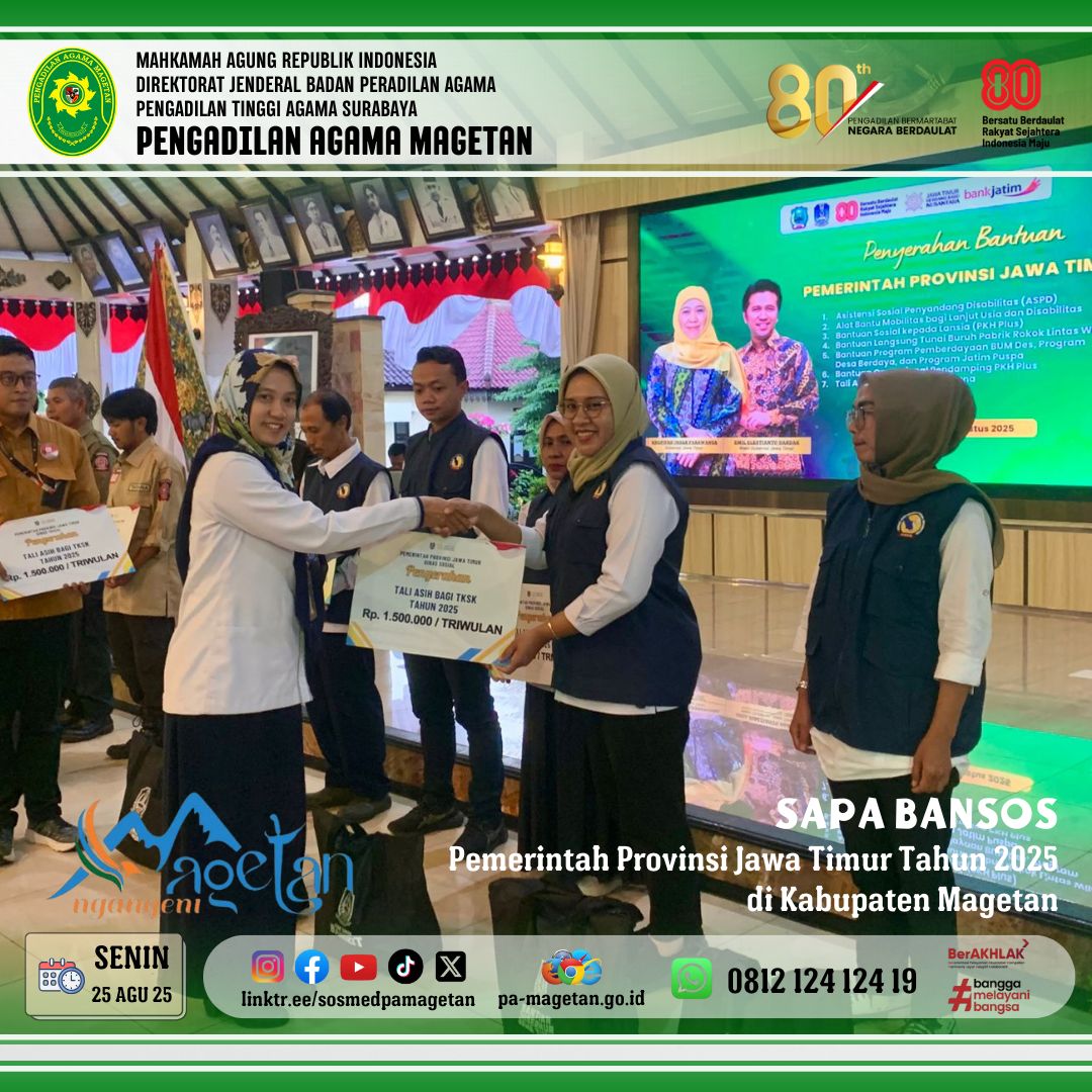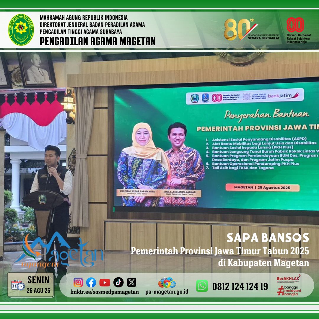 Magetan – Senin (25/8/2025), Pemerintah Provinsi Jawa Timur menyerahkan bantuan sosial di Pendopo Surya Graha Magetan. Acara berlangsung khidmat dengan dihadiri unsur Forkopimda, perwakilan instansi, serta masyarakat penerima bantuan. Pengadilan Agama Magetan turut serta dalam kegiatan ini dan diwakili oleh Ibu Hj. Nilna Niamatin, S.Ag, M.H. Acara dimulai dengan sambutan Kepala Dinas Sosial Prov. Jawa Timur Dra. Restu Novi Widiani, M.M. yang menekankan pentingnya penyaluran bantuan dapat menekan angka kemiskinan. “Semoga bantuan sosial yang diberikan kepada penerima pada hari ini dapat bermanfaat dan diharapkan bisa menekan angka kemiskinan di Jawa Timur, khususnya Kab. Magetan,” ujarnya.