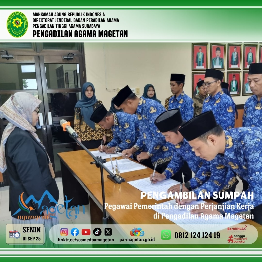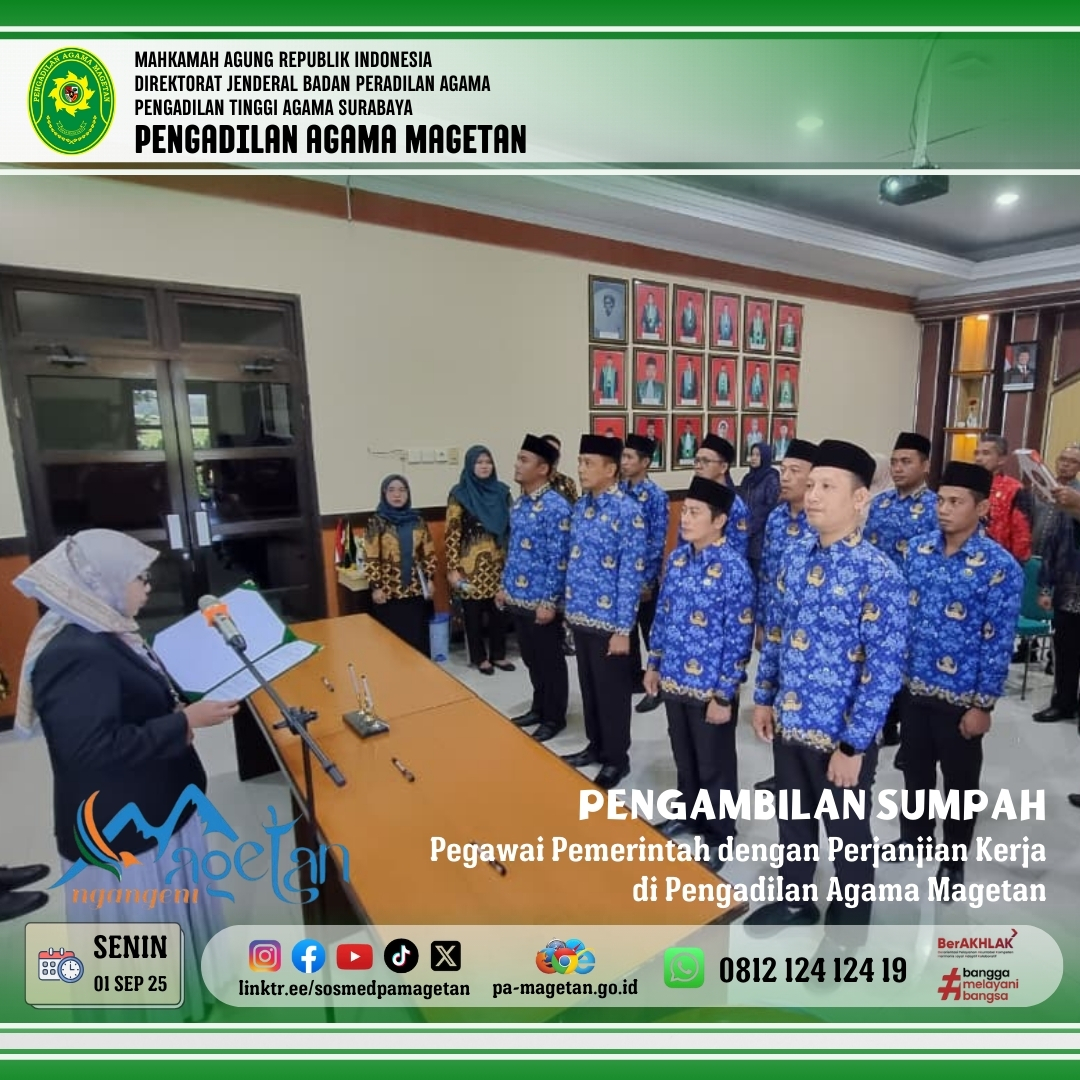 Pada hari ini, Senin, 1 September 2025, bertempat di media center Pengadilan Agama (PA) Magetan, telah dilaksanakan acara Pengambilan Sumpah Pegawai Pemerintah dengan Perjanjian Kerja (PPPK). Acara dimulai pukul 08.00 WIB dan dipimpin langsung oleh Ketua Pengadilan Agama Dr. Hermin Sriwulan, S.H.I., S.H., M.H.I. Sebanyak 11 orang pegawai PPPK mengikuti prosesi pengambilan sumpah dan penandatanganan berita acara sumpah.