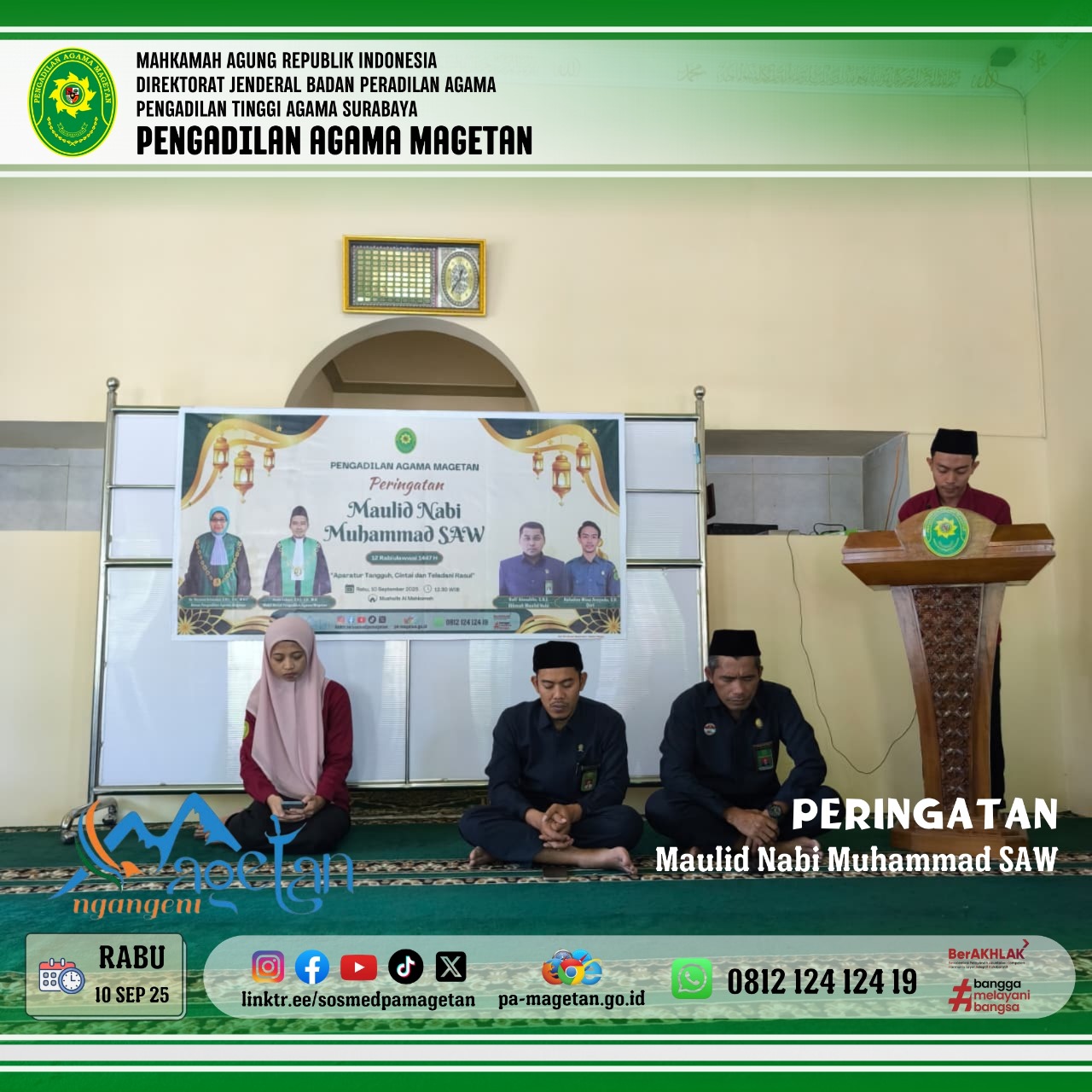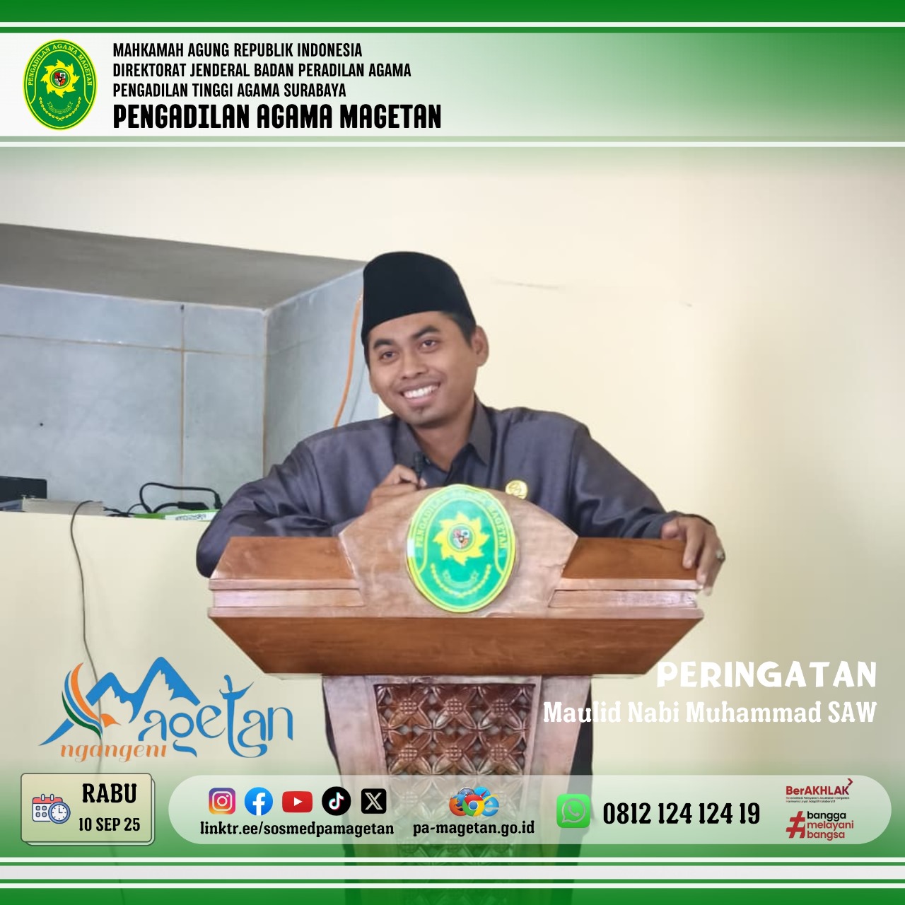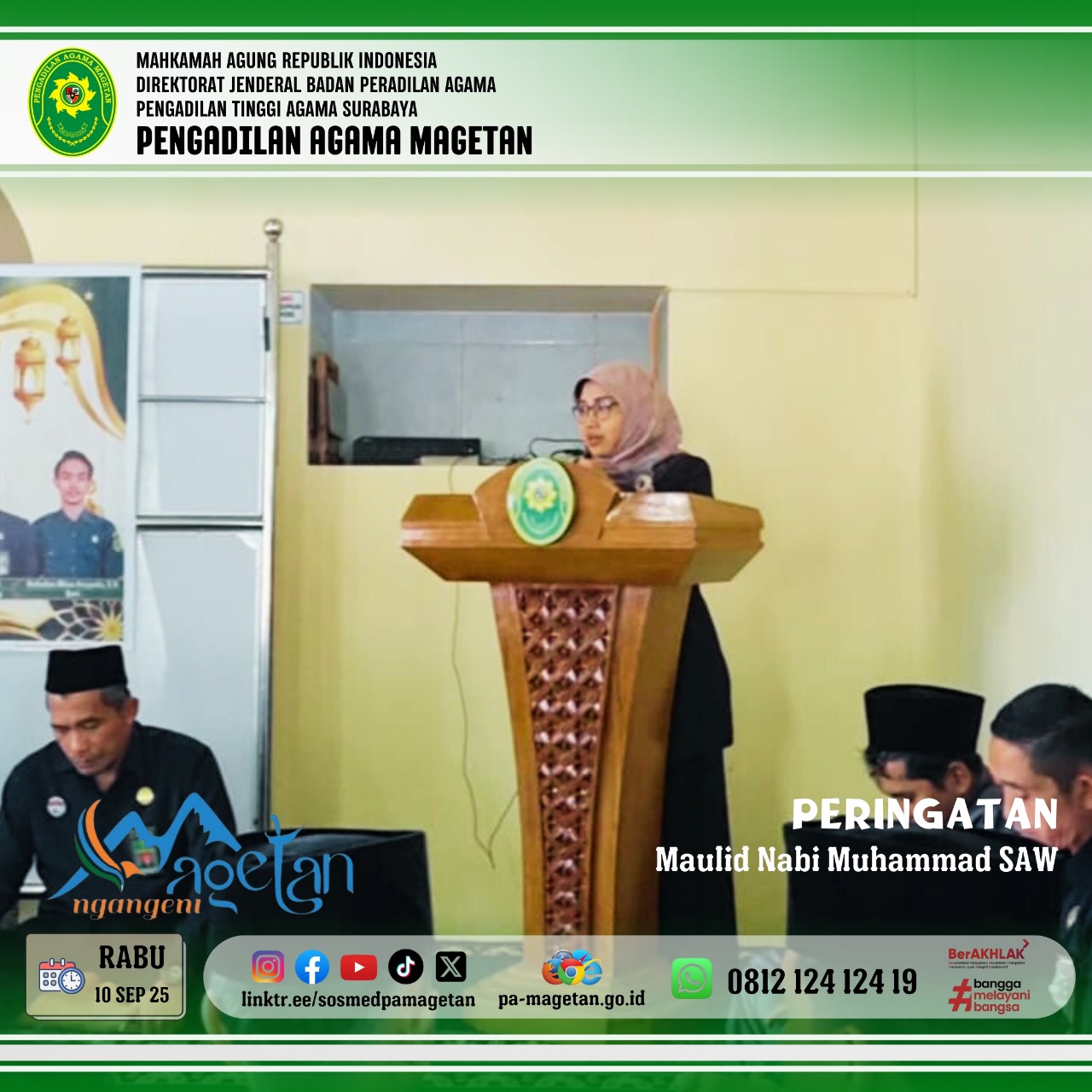 Peringatan Maulid Nabi Muhammad SAW di Pengadilan Agama Magetan ini dilaksanakan dalam rangka meningkatkan keimanan dan ketakwaan kepada Allah SWT, serta untuk memperingati kelahiran Rasulullah Muhammad SAW yang merupakan tauladan bagi umat Islam di seluruh dunia. Kegiatan dimulai dengan pembacaan ayat suci Al-Quran oleh Rofadan Mina Arsyada, S.H., kemudian, para peserta mendengarkan ceramah keagamaan yang disampaikan oleh Rofi' Almuhlis, S.H.I., Dengan tema Aparatur Tangguh, Dicintai, dan Teladani Rosul, ceramah tersebut membahas kehidupan dan ajaran Rasulullah SAW serta pesan-pesan kebaikan yang dapat diambil dari kehidupan beliau.