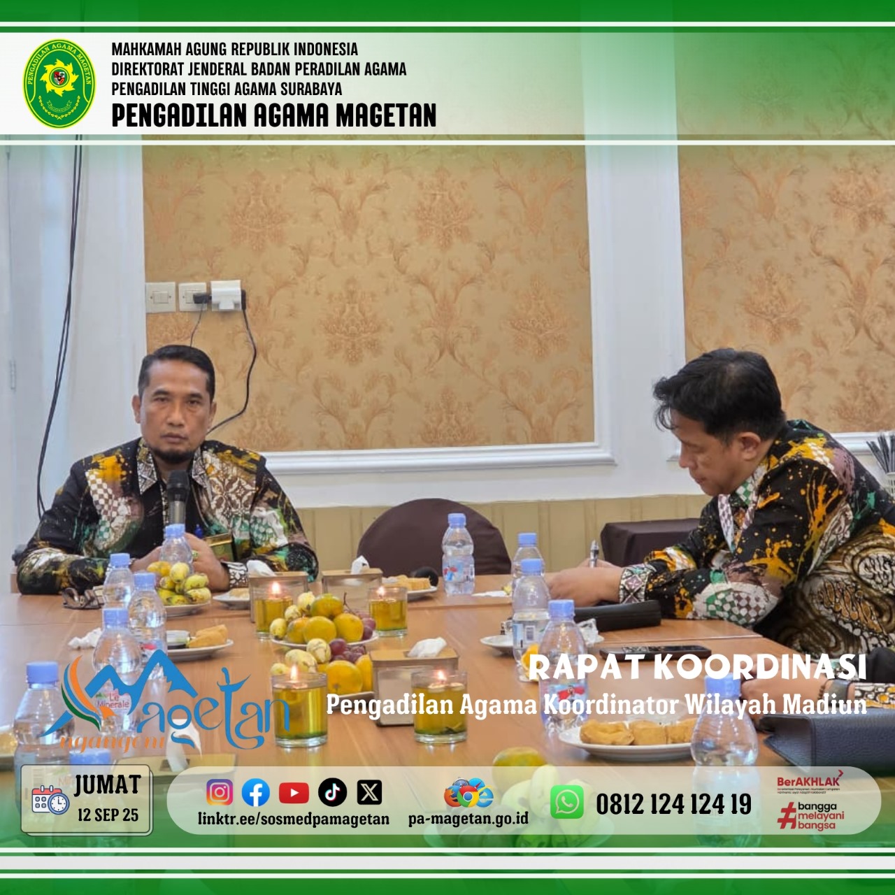 Magetan, 12 September 2025 – Pengadilan Agama Ponorogo menjadi tuan rumah Rapat Koordinasi (Rakor) Pengadilan Agama Koordinator Madiun pada Jumat (12/9). Kegiatan ini dihadiri oleh Ketua Pengadilan Agama Magetan, Dr. Hermin Sriwulan, S.H.I., S.H., M.H.I., Panitera Hj. Nilna Niamatin, S.H., M.H., serta para ketua, panitera, dan sekretaris sekoordinator Madiun.