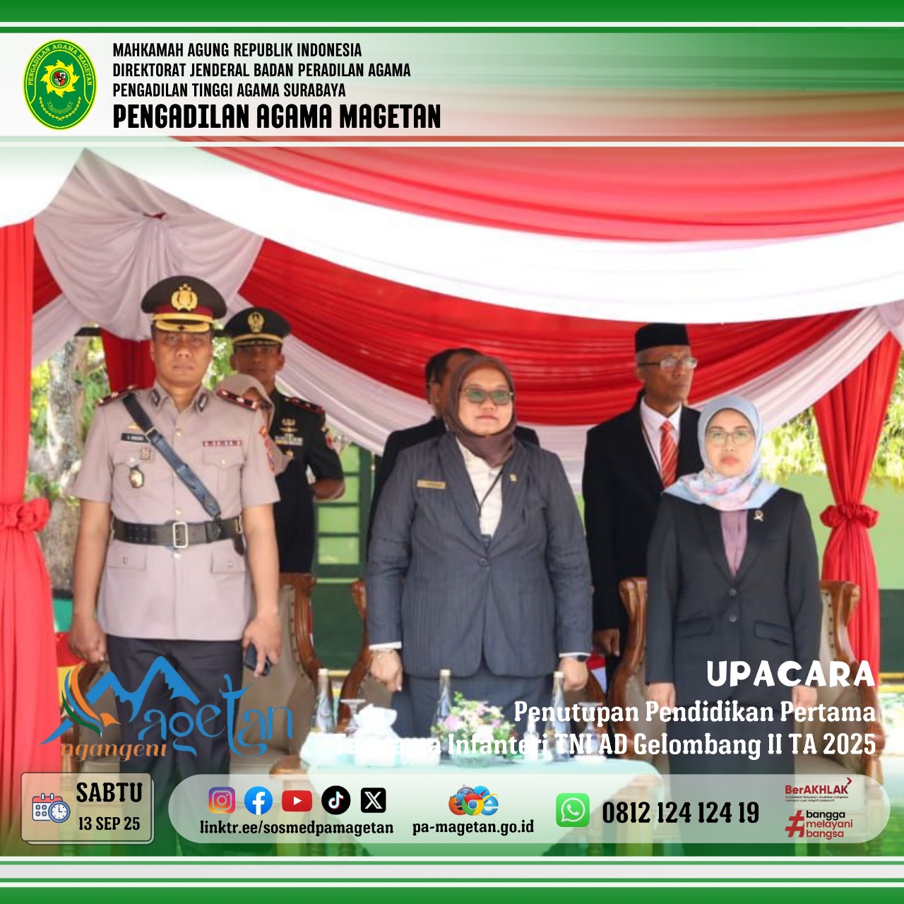 Magetan | pa-magetan.go.id | Bertempat di Lapangan Chandradhimuka Secata Rindam V/Brawijaya, dilaksanakan Upacara Penutupan Pendidikan Pertama Tamtama Infanteri TNI AD Gelombang II TA 2025 pada hari Sabtu (13/9). Turut hadir dalam upacara tersebut Wakil Bupati Magetan, serta Forkopimda Kabupaten Magetan. Dalam acara tersebut, Pengadilan Agama Magetan diwakili oleh Ketua YM. Dr. Hermin Sriwulan, S.H.I., S.H., M.H.I.