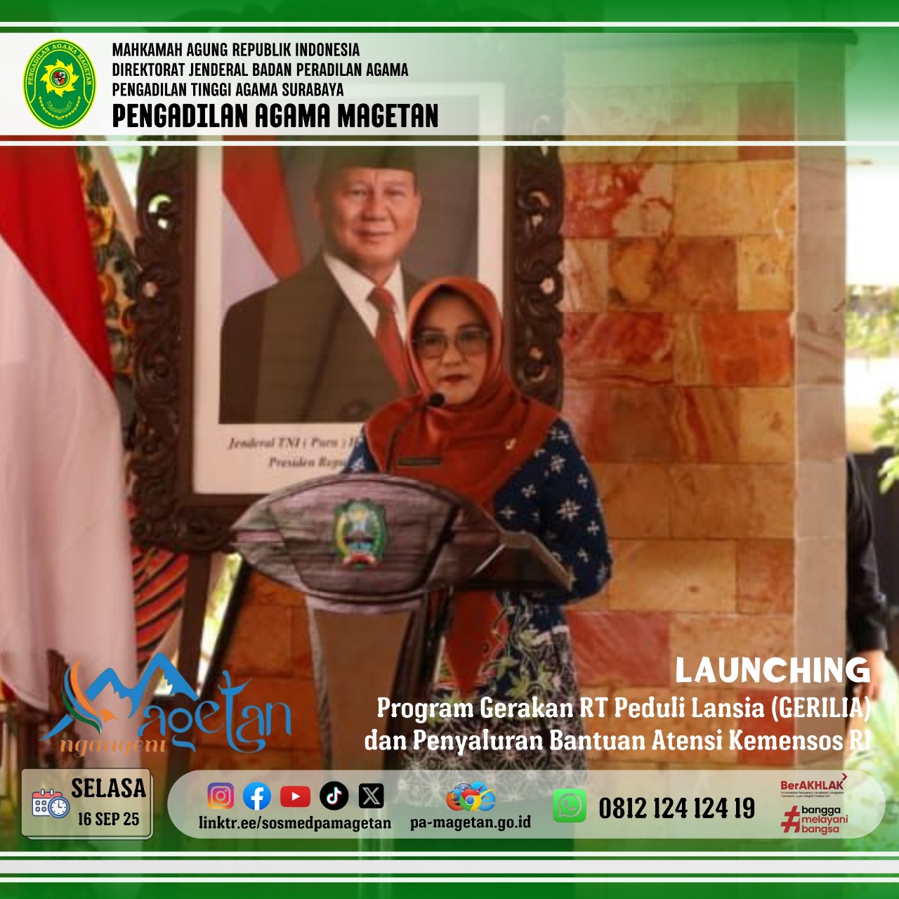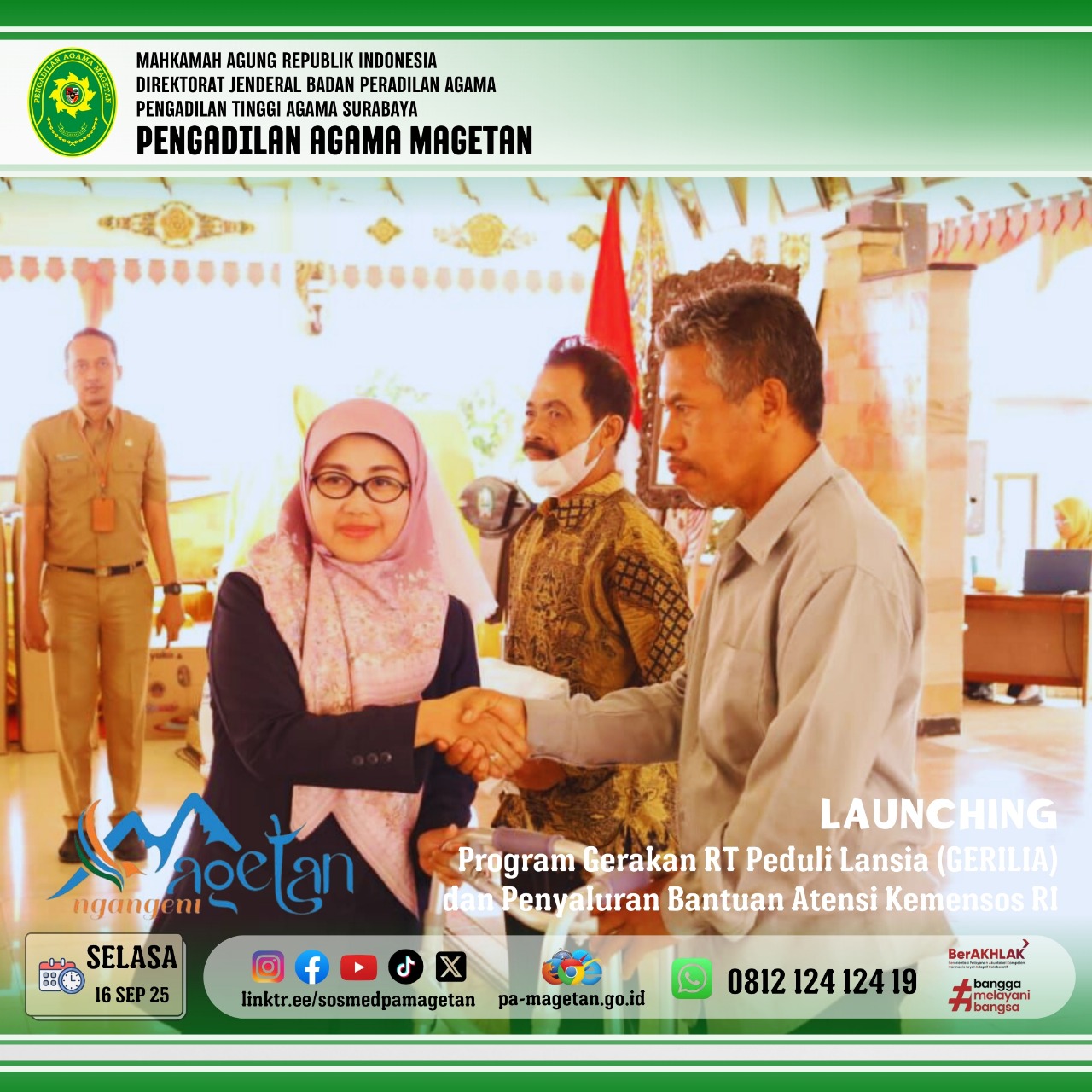 Magetan | pa-magetan.go.id | Selasa (16/9/2025) Pemerintah Daerah Kabupaten Magetan menggelar launching Program Gerakan RT Peduli Lansia (Gerilia) dan Penyaluran Bantuan sosial Atensi Kemensos RI yang bertempat di pendopo surya graha. Acara dihadiri oleh Dr. Hermin Sriwulan, S.H.I.,S.H.,M.H.I sebagai perwakilan Pengadilan Agama Magetan, Bupati, wakil bupati Magetan, KA. Sentra Terpadu Kartini Temanggung, PJ Sekdakab, Asisten dan Staf Ahli, Ka.Opd terkait serta para penerima bantuan. Acara tersebut diawali dengan laporan dan pemaparan program yang disampaikan oleh Kepala Dinas Sosial. Kepala Sentra Terpadu Kartini Temanggung turut memberikan sambutan yang menekankan pentingnya semangat kolaborasi untuk mendukung kesejahteraan lansia.