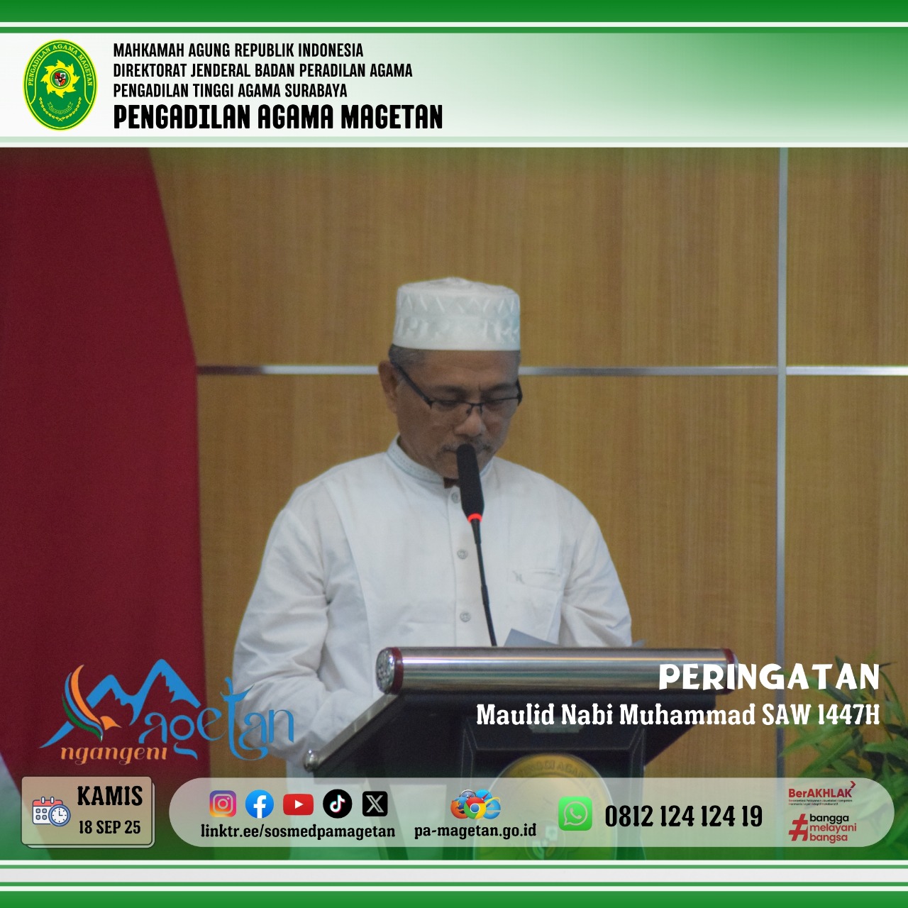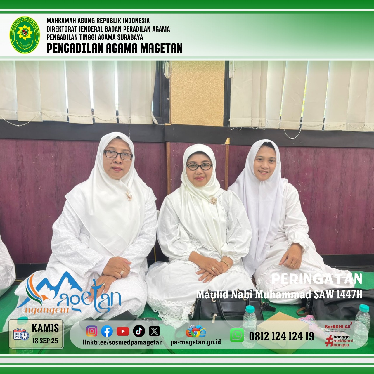 Magetan | pa-magetan.go.id | PA Magetan Hadiri Perayaan Maulid Nabi Muhammad SAW di PTA Surabaya. Pada Kamis (18/09/2025) bertempat di Pengadilan Tinggi Agama Surabaya dilaksanakan Perayaan Maulid Nabi Muhammad SAW 1447 H dengan tema “Meneladani Akhlaq Nabi Muhammad SAW Sebagai Role Model Manusia”. Acara dimulai pukul 08.30 WIB dan juga disiarkan secara langsung melalui kanal PTA Surabaya Media. Suasana perayaan berlangsung penuh khidmat dengan lantunan hadrah dari Tim Hadrah Al Huda.