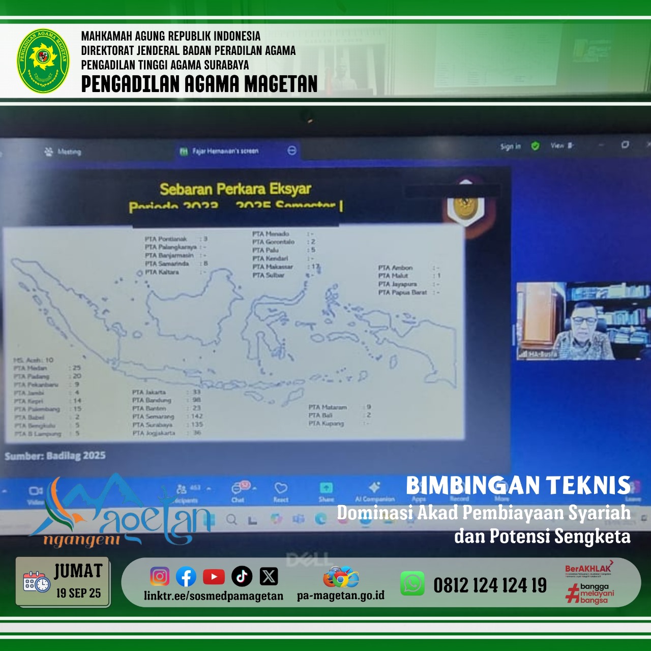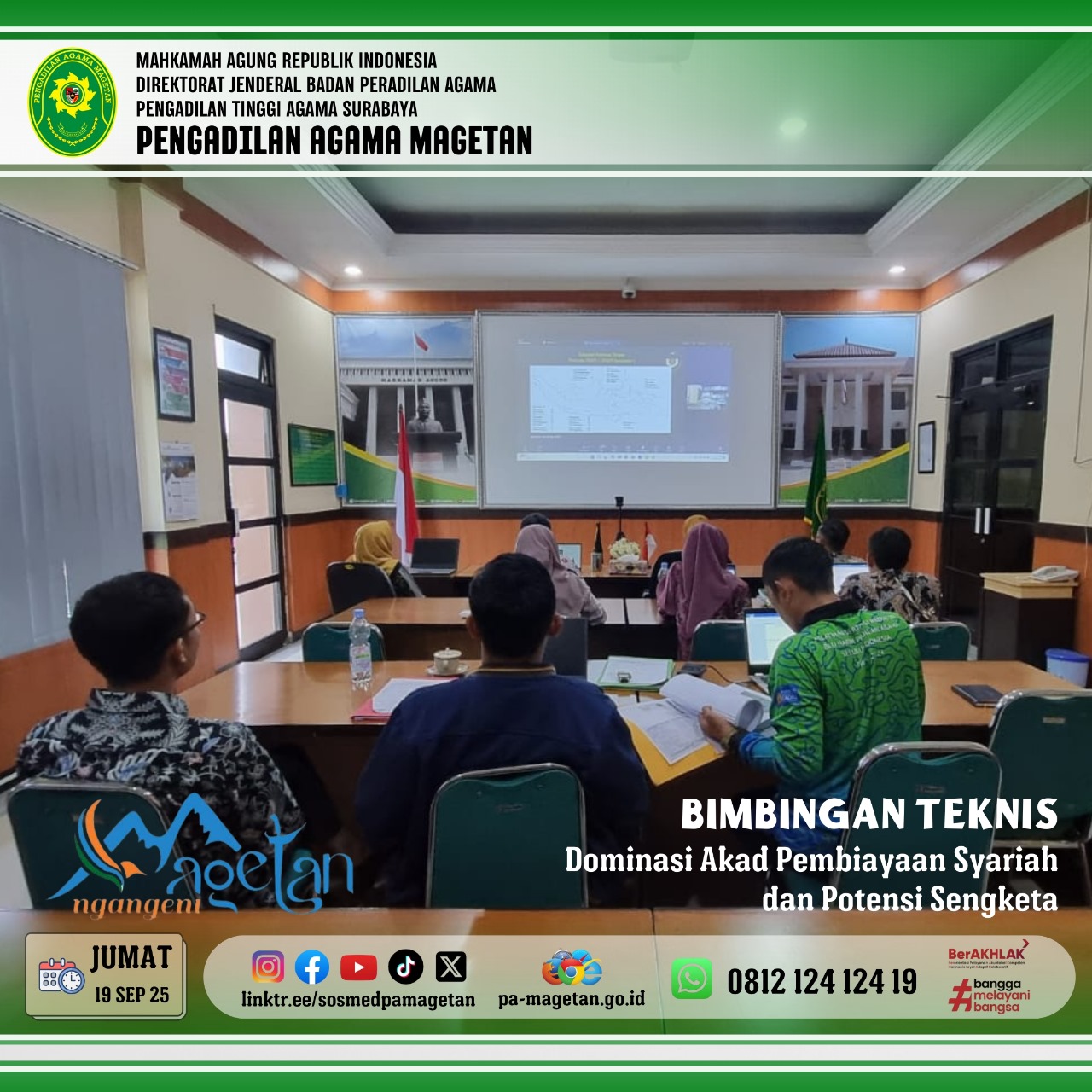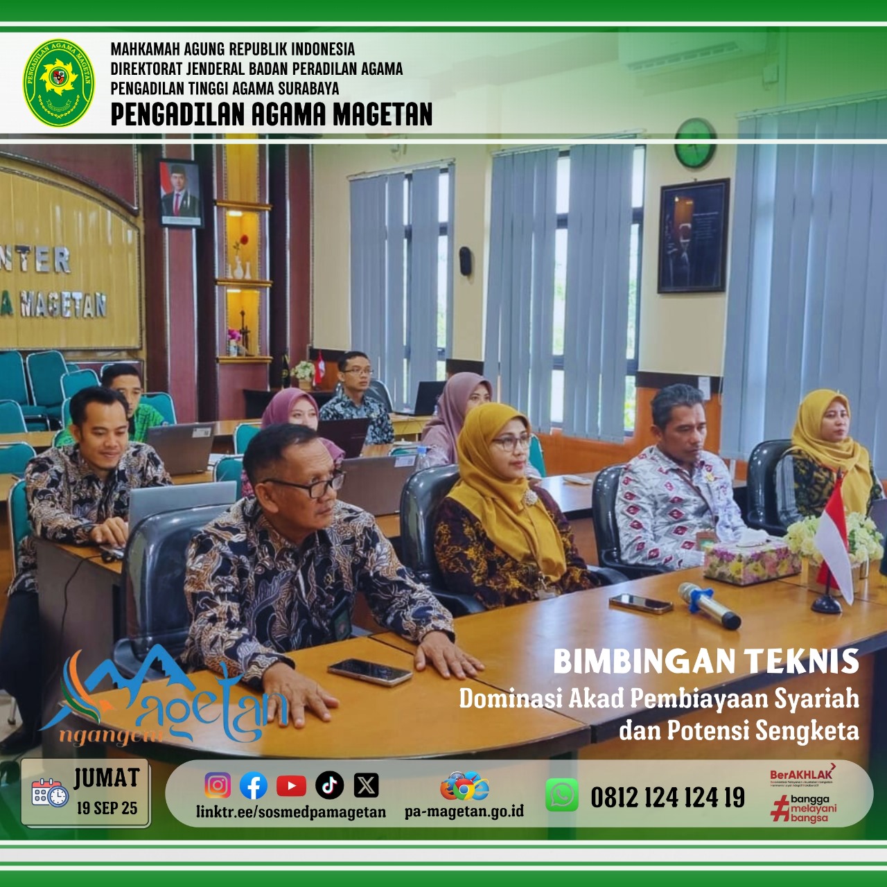 Magetan | pa-magetan.go.id| Pada hari Jumat, 19 September 2025 pukul 08.00, Pengadilan Agama Magetan mengikuti kegiatan bimbingan teknis peningkatan kompetensi tenaga teknis secara daring. Acara ini dilaksanakan di Media Center Pengadilan Agama Magetan sebagai pusat koordinasi. Kegiatan tersebut bertujuan untuk menambah wawasan dan pemahaman para hakim terkait isu-isu aktual di bidang hukum ekonomi syariah. Peserta yang hadir adalah Ketua Ibu Dr. Hermin Sriwulan, S.H.I., S.H., M.H.I dan Wakil Ketua Bapak Huda Lukoni, S.H.I., S.H., M.H beserta Para Hakim Pengadilan Agama Magetan.