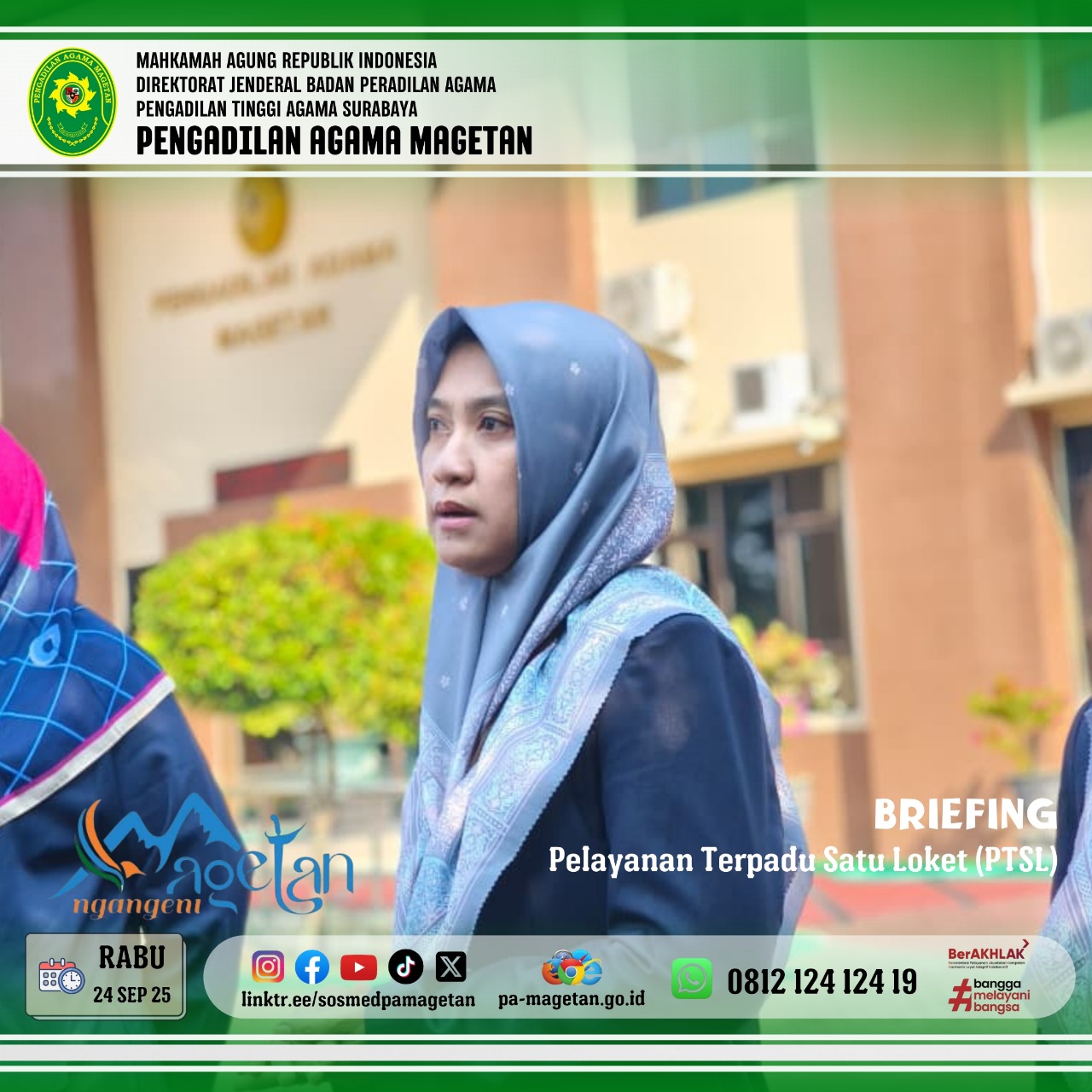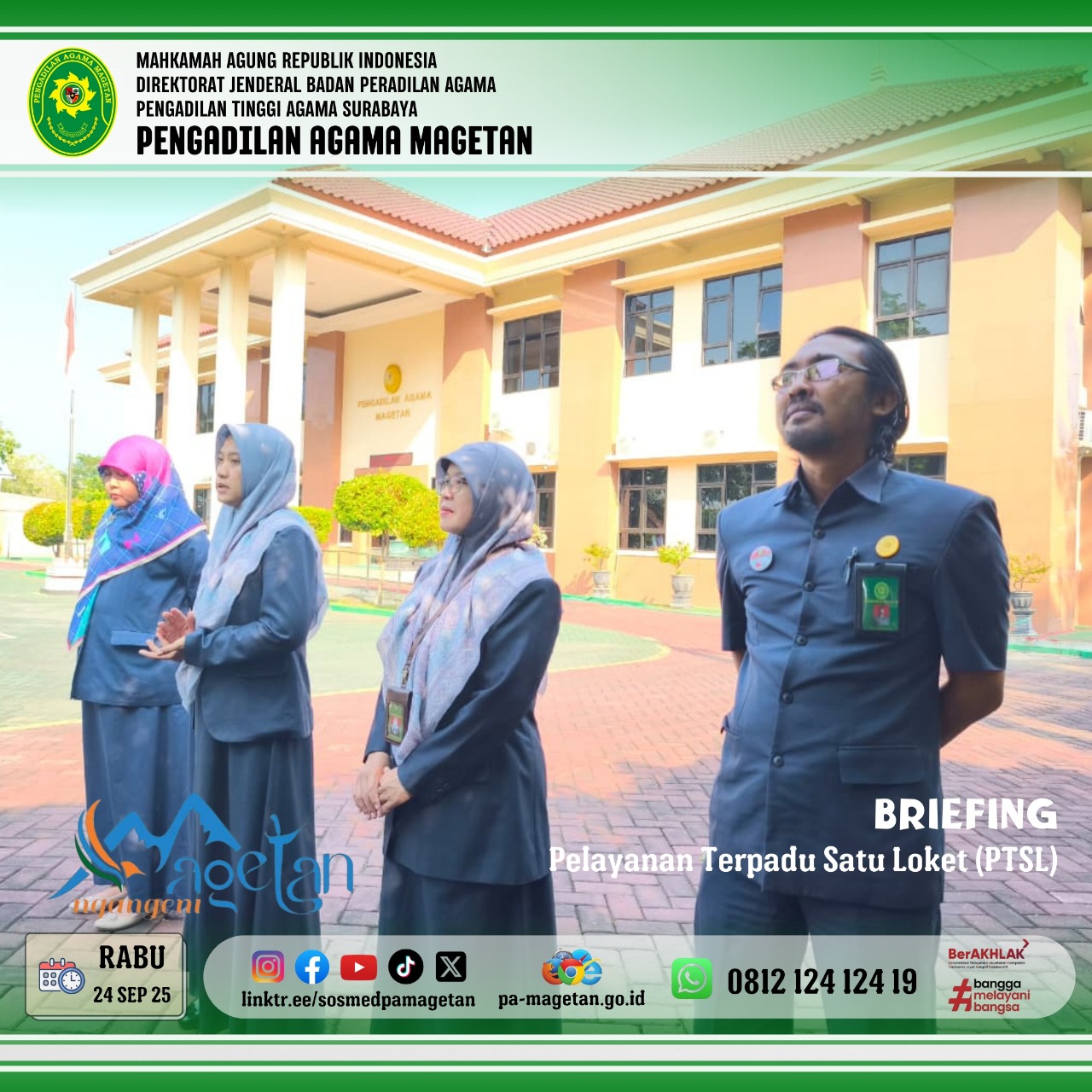 Magetan | pa-magetan.go.id |Pada hari Rabu (24/09/2025), petugas Pelayanan Terpadu Satu Loket (PTSL) melaksanakan briefing rutin setelah melaksanaan Morning Briefing. Kegiatan ini dipimpin oleh Panitera Ibu Hj. Nilna Niamatin, S.Ag, M.H., yang memberikan arahan penting kepada seluruh petugas. Briefing tersebut bertujuan untuk meningkatkan profesionalisme serta koordinasi dalam pelayanan kepada masyarakat. Seluruh petugas diwajibkan hadir tepat waktu guna menerima instruksi yang disampaikan.