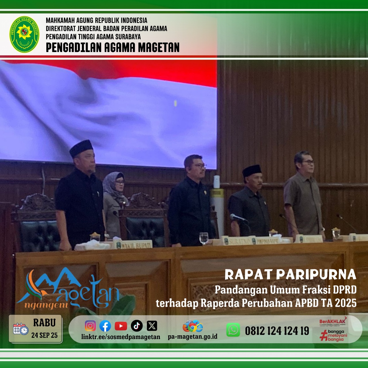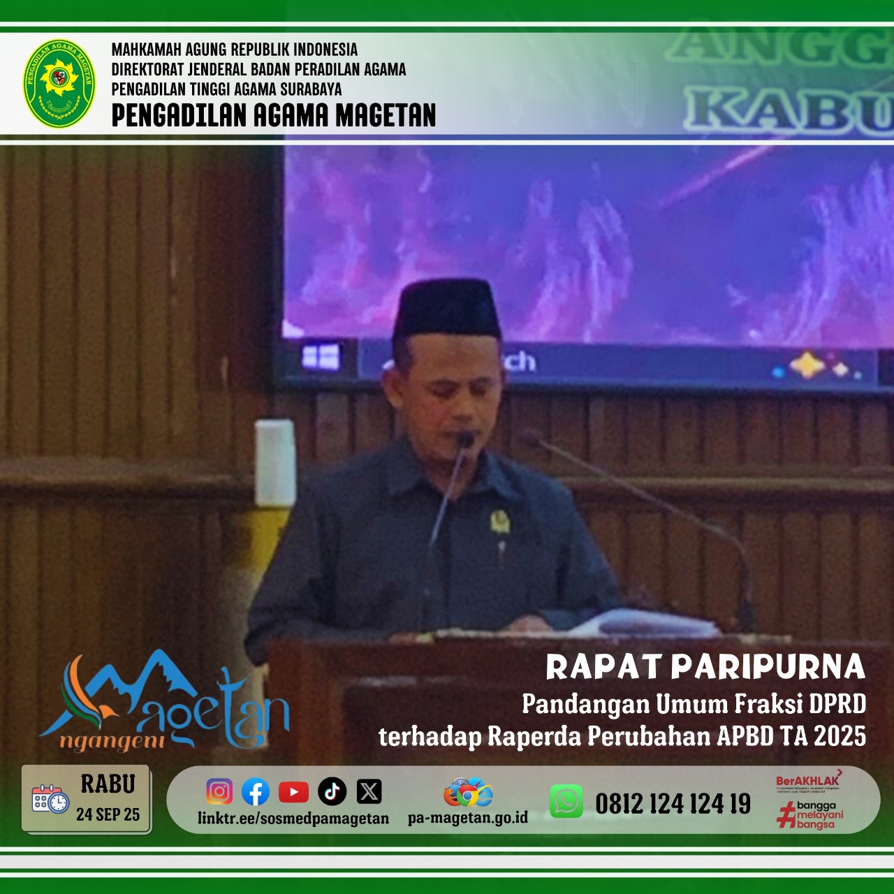 Magetan | pa-magetan.go.id – Dewan Perwakilan Rakyat Daerah (DPRD) Kabupaten Magetan menyelenggarakan rapat paripurna dengan agenda Pandangan Umum Fraksi DPRD terhadap Raperda Perubahan APBD Tahun Anggaran 2025 pada Rabu (24/09/2025). Kegiatan berlangsung di Ruang Rapat Paripurna DPRD Kabupaten Magetan mulai pukul 10.00 WIB. Pengadilan Agama Magetan turut hadir dalam acara tersebut yang diwakili oleh Panitera, Hj. Nilna Niamatin, S.Ag., M.H. Kehadiran beliau merupakan bentuk dukungan dalam rangka sinergi antar lembaga.