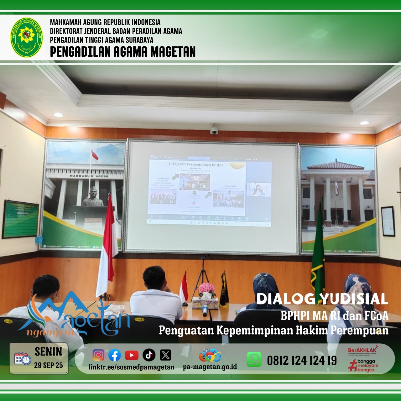 Magetan | pa-magetan.go.id | Senin, 29 September 2025, digelar forum Zoom yang bertema inspirasi dan penguatan kepemimpinan hakim perempuan. Acara ini diselenggarakan oleh BPHPI yang lahir dari semangat kesetaraan di lingkungan peradilan Indonesia. Pengadilan Agama Magetan turut serta dalam acara ini, yang mana dihadiri oleh Ibu Ketua Dr. Hermin Sriwulan, S.H.I., S.H., M.H.I., dan para hakim yaitu Ibu Uswatul Fikriyah, S.H.I., M.H., Bapak Helmy Ziaul Fuad, S.H.I., S.H., M.H.,, dan Bapak Rofi' Almuhlis, S.H.I.. Para peserta mengikuti paparan sejarah BPHPI dengan antusias untuk memahami bagaimana organisasi ini terbentuk dan berkembang.