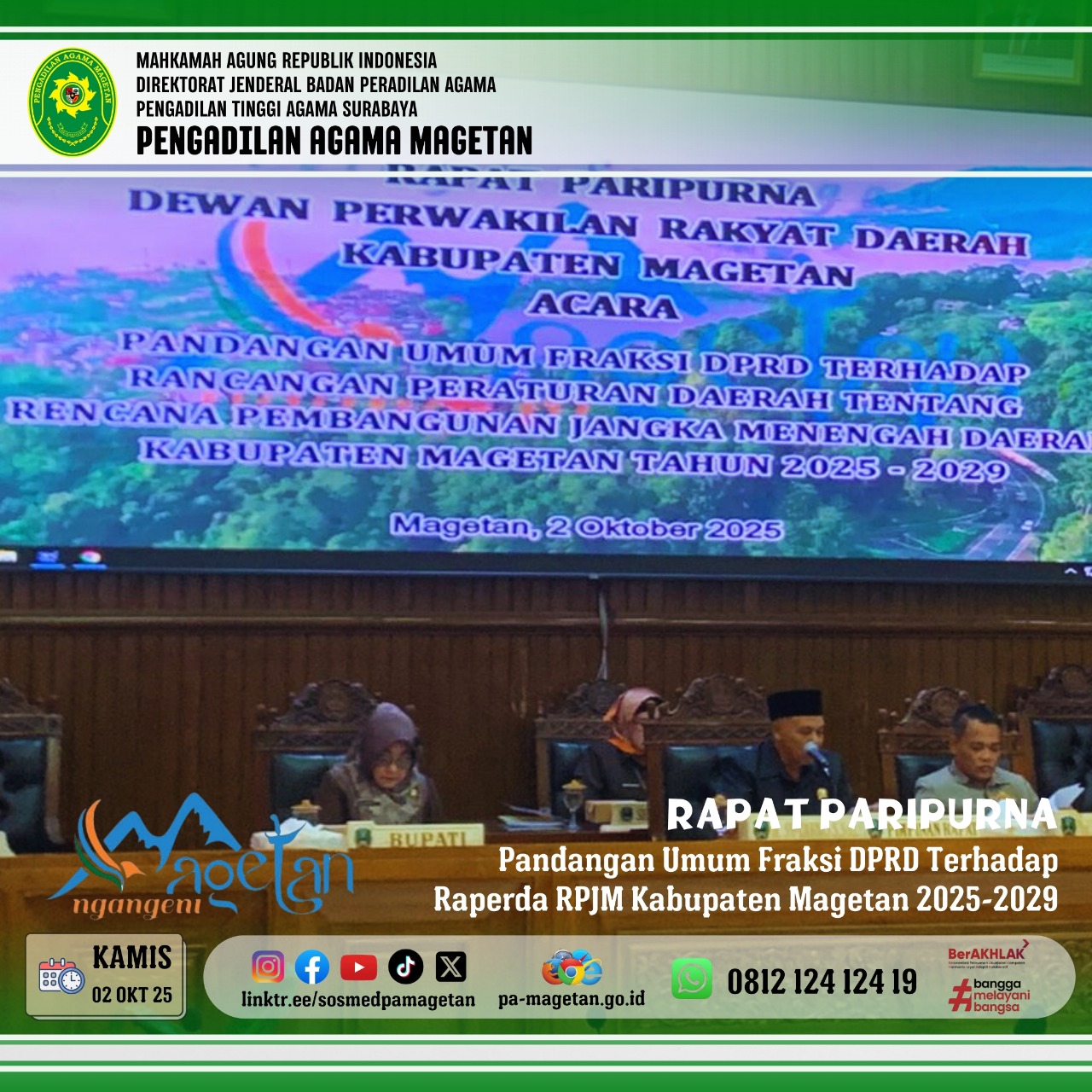 Magetan | pa-magetan.go.id | Kamis (02/10/2025) Pengadilan Agama Magetan menghadiri Rapat Paripurna DPRD Kabupaten Magetan dengan agenda Pandangan Umum Fraksi DPRD terhadap Rancangan Peraturan Daerah (Raperda) RPJMD Kabupaten Magetan Tahun 2025–2029. Kegiatan ini digelar di Gedung DPRD Kabupaten Magetan dengan dihadiri jajaran pemerintah daerah serta unsur Forkopimda.