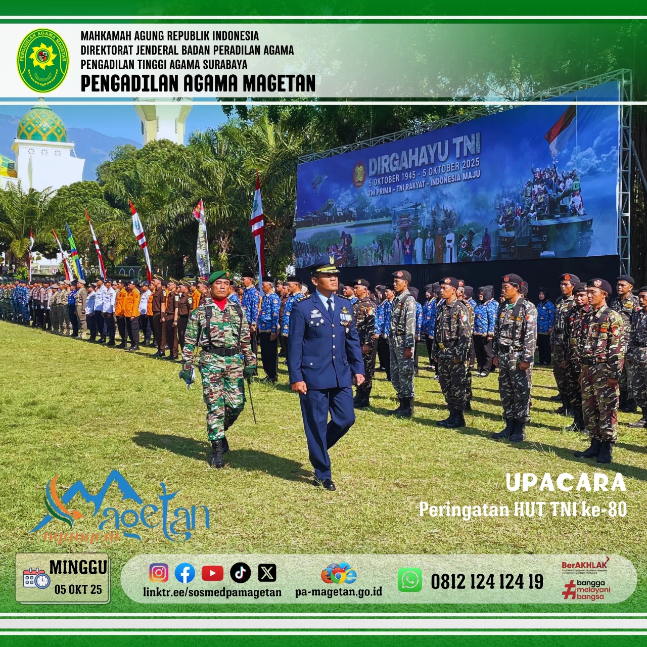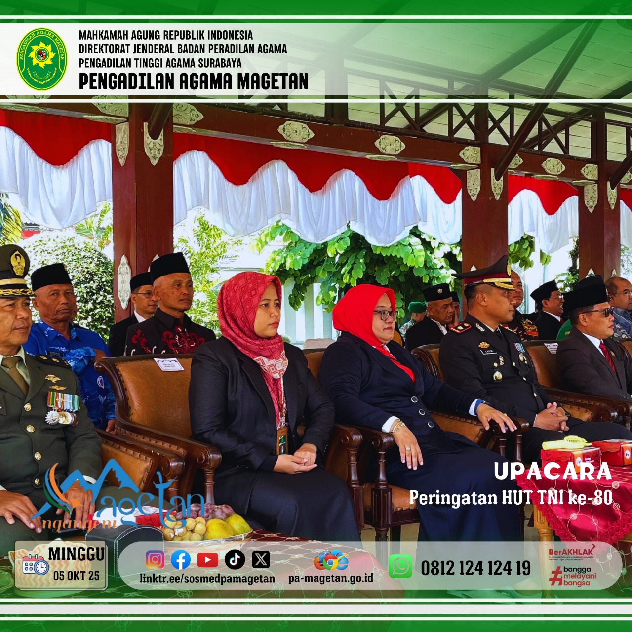 Magetan | pa-magetan.go.id | Upacara peringatan Hari Ulang Tahun (HUT) ke-80 Tentara Nasional Indonesia (TNI) di Kabupaten Magetan berlangsung khidmat dan meriah. Upacara peringatan dipusatkan di Alun-Alun Magetan pada Minggu, 5 Oktober 2025, dengan mengusung tema "TNI Prima, TNI Rakyat, Indonesia Maju." Forkopimda Magetan kompak hadir dalam acara tersebut. Pengadilan Agama Magetan diwakili oleh Hakim Ibu Miftakul Khoriyah, S.H.I., M.H.
