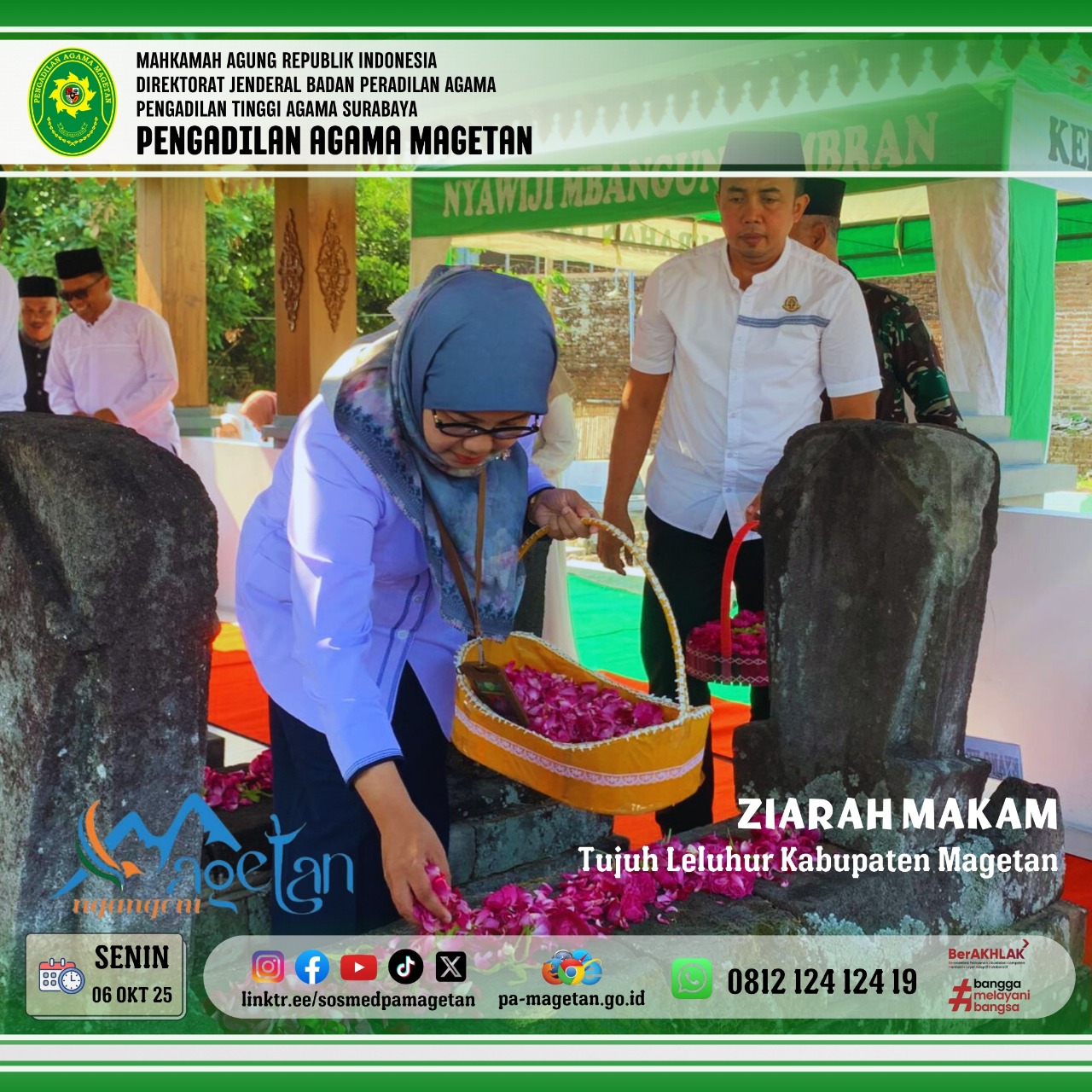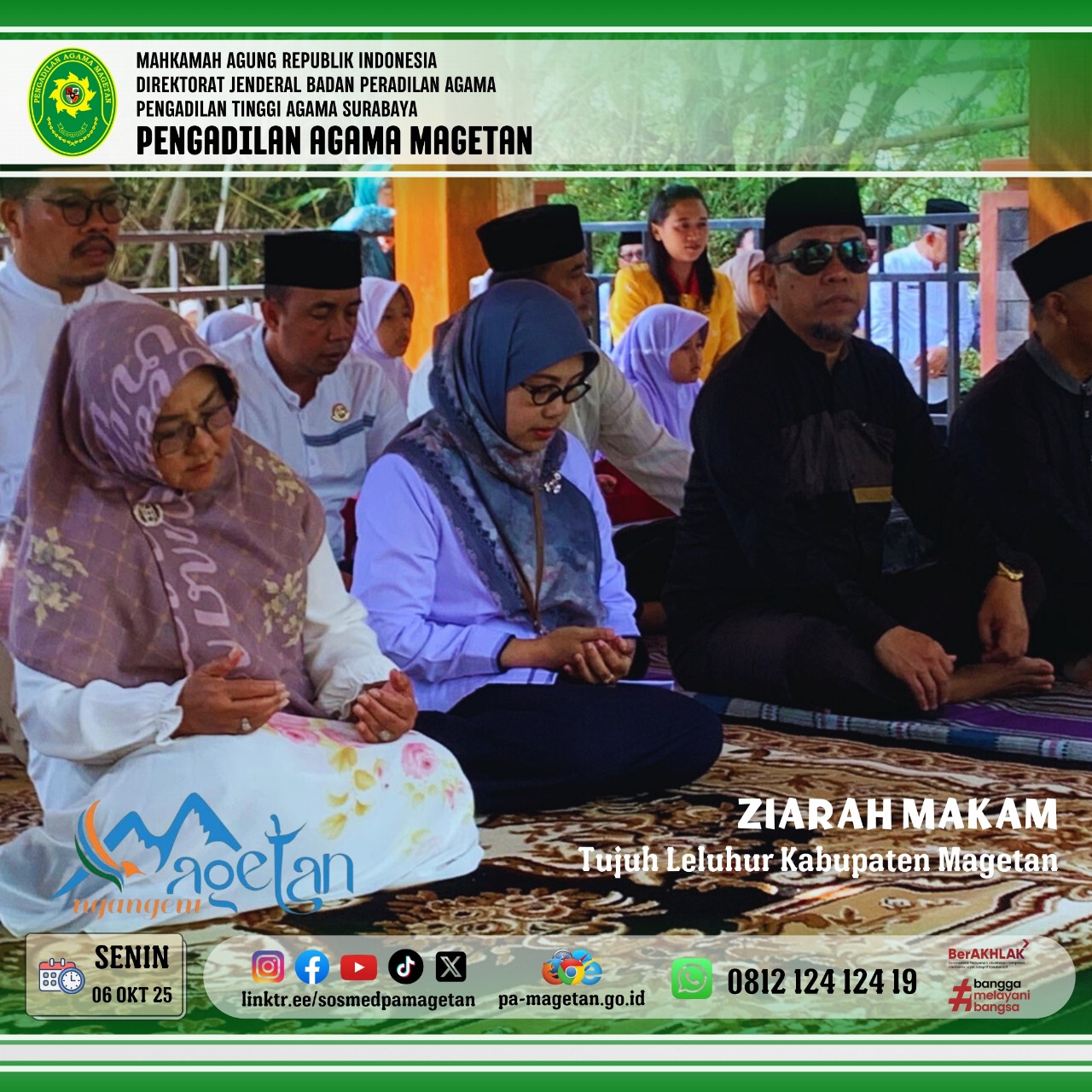 Ketua Pengadilan Agama Magetan, Dr. Hermin Sriwulan, S.H.I., S.H., M.H.I., ikut serta dalam rangkaian kegiatan Hari Jadi ke-350 Kabupaten Magetan. Salah satu agenda yang dilaksanakan pada Senin, 6 Oktober 2025 adalah ziarah ke 7 makam leluhur. Kegiatan ini digelar oleh Pemerintah Kabupaten Magetan sebagai bentuk penghormatan terhadap para tokoh pendiri daerah. Ziarah dilakukan bersama unsur Forkopimda, tokoh masyarakat, serta pejabat daerah lainnya.