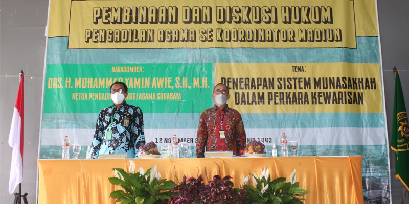 Sebelum acara dimulai Ketua Koordinator Pengadilan Agama se-Koordinator Madiun (Dr. H. Ahmad Zaenal Fanani, S.H.I, M.Si.) mengucapkan terimakasih kepada seluruh perserta yang hadir, dan apresiasi khusus untu peserta dari PA Pacitan yang rela menerjang banjir demi menghadiri acara diskusi hukum ini. Beliau juga menyampaikan bahwa ini merupakan kesempatan yang baik untuk mempelajari ilmu munasakhah dengan narasumber yang ahli di bidang ini, yaitu Drs. H. M. Yamin Awie, S.H., M.H