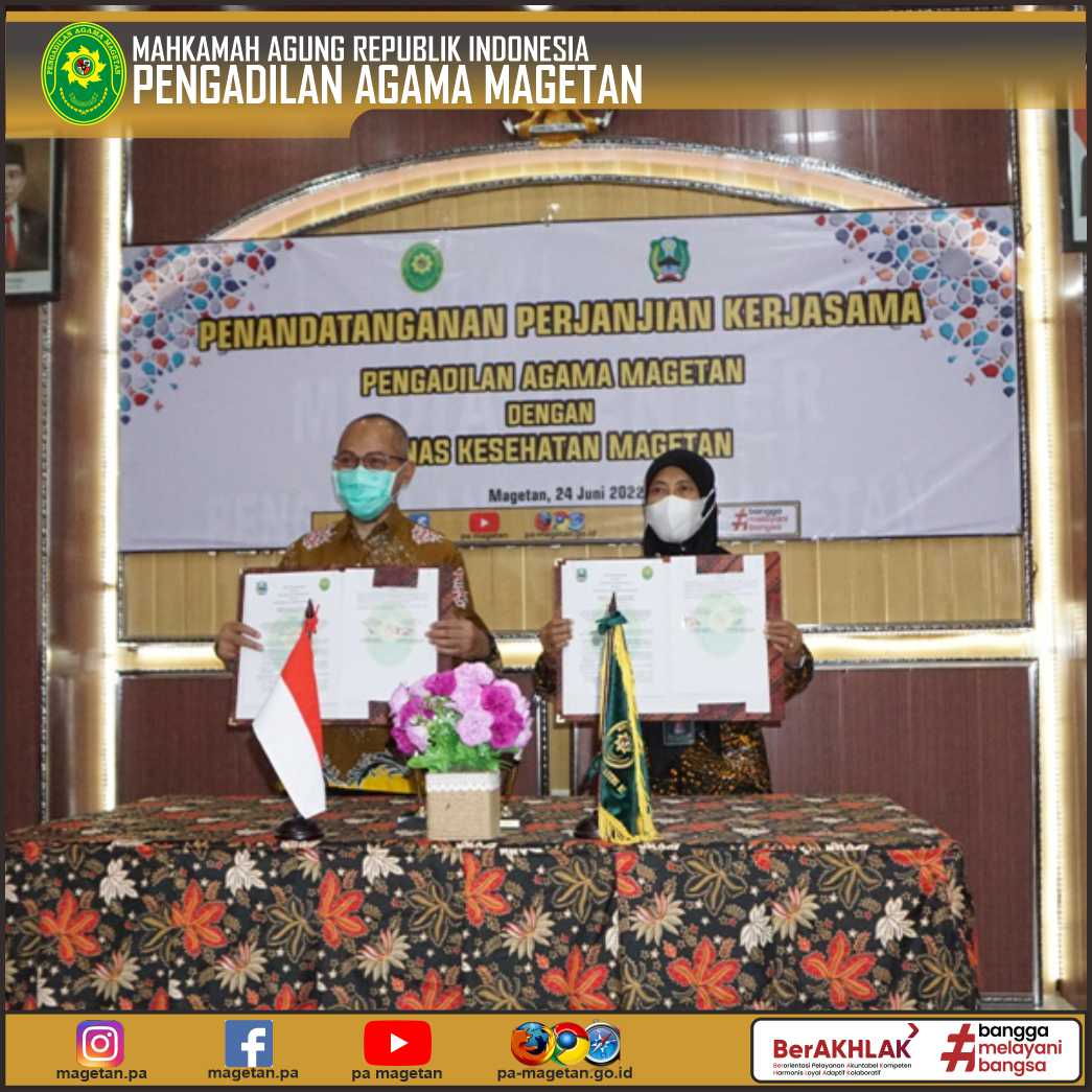 Magetan | pa-magetan.go.id | Pengadilan Agama Magetan melaksanakan Penandatanganan Perjanjian Kerjasama dengan Dinas Kesehatan Magetan. Perjanjian kerjasama ini dilaksanakan dalam rangka pemenuhan Peraturan Mahkamah Agung No. 5 Tahun 2019 tentang Pedoman Mengadili Permohonan Dispensasi Kawin serta menindaklanjuti surat Direktur Jenderal Kesehatan Masyarakat Kementerian Kesehatan Republik Indonesia No. HK.01.2/B/275/2022 tanggal 11 April 2022 tentang tindak lanjut audiensi perkawinan.