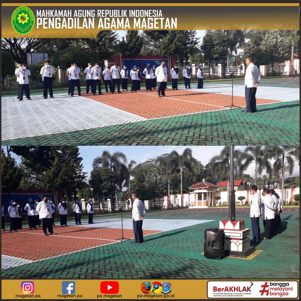 Magetan | pa-magetan.go.id | Pengadilan Agama Magetan melaksanakan kegiatan Apel Senin pagi, Apel kali ini dipimpin oleh Hakim Pengadilan Agama Magetan (YM Dr. SUGENG, M.Hum). Dalam arahannya beliau menyampaikan minggu ini kita akan ada pengawasan HATIWASDA dari Tim PTA Surabaya, mohon semua dapat mempersiapkan dengan baik. Selanjutnya mohon untuk terus meningkatkan pelayanan, terutama di PTSP dan persiapan persidangan, mohon untuk kelengkapan persidangan dapat dijadikan perhatian untuk kelengkapannya.