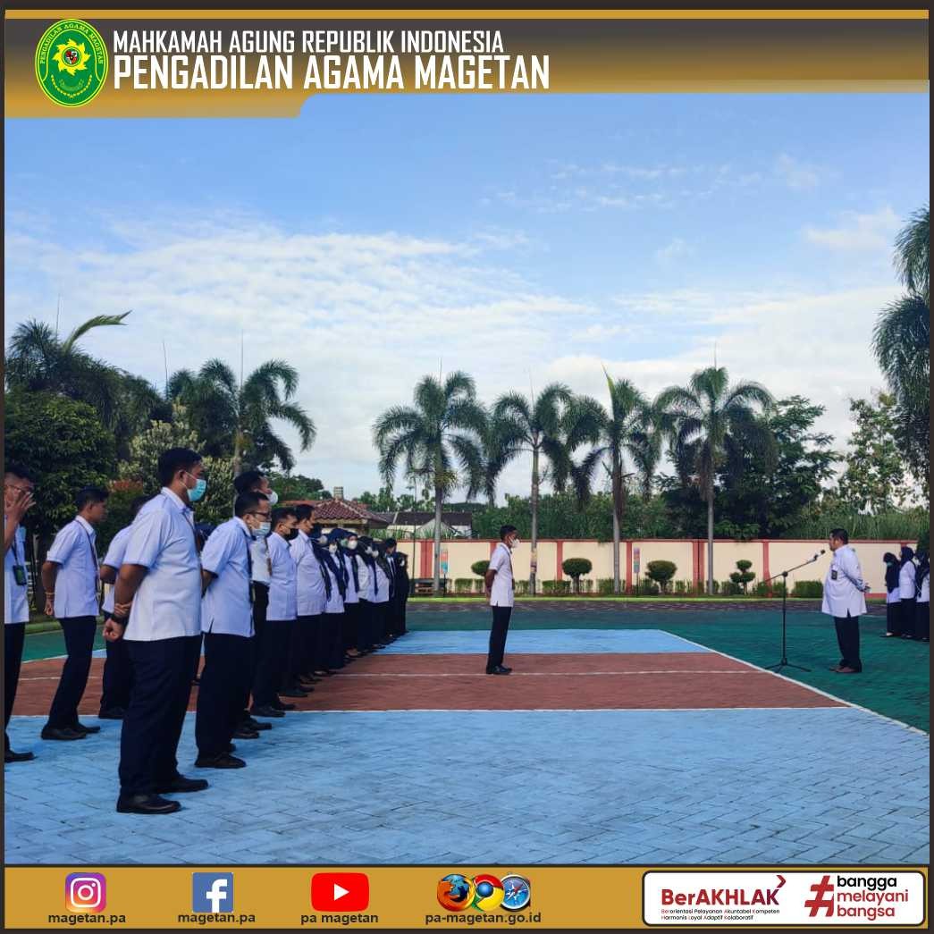 Magetan | pa-magetan.go.id | Pengadilan Agama Magetan melaksanakan kegiatan Apel Senin pagi, Apel kali ini dipimpin oleh Hakim Pengadilan Agama Magetan (YM Syahrullah, S.H.I., M.H.). Dalam arahannya beliau menyampaikan dimohon kepada seluruh aparatur Pengadilan Agama Magetan untuk dapat meningkatkan kinerjanya sesuai tupoksinya, sehingga kita dapat bekerja dengan baik dan lancar.