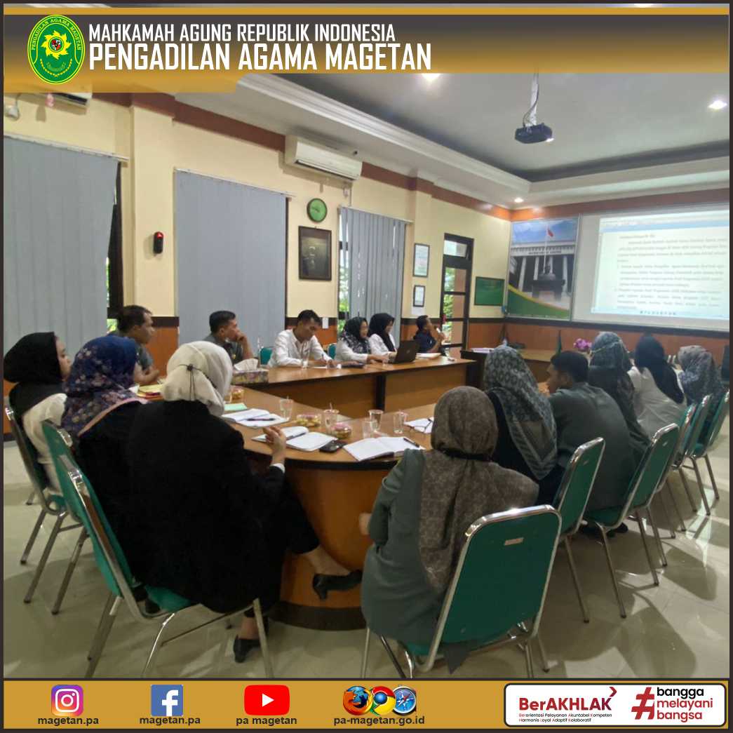 Dalam rapat ini, Panitera Pengadilan Agama Magetan menekankan pentingnya peningkatan pelayanan yang diberikan kepada setiap masyarakat yang datang ke Pengadilan dengan selalu memberikan pelayanan yang terbaik agar sesuai dengan kebutuhan dan harapan masyarakat yang datang ke Pengadilan Agama Magetan.