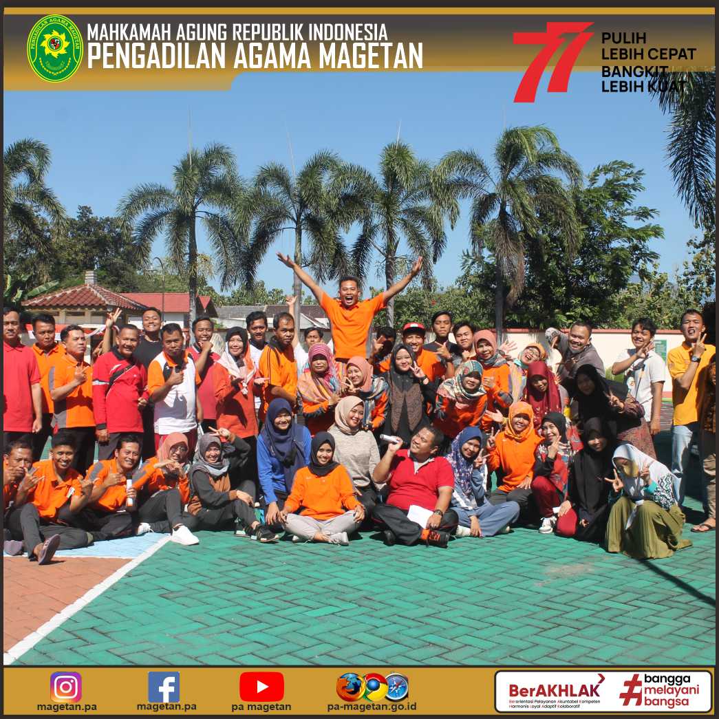 Dalam sambutannya Ketua Pengadilan Agama Magetan (YM. Eny Rianing Taro, S.Ag., M.Sy) menyampaikan bahwa kegiatan ini sebagai salah satu kesemarakan peringatan dalam merayakan beberapa acara yang ada di bulan agustus ini. Dengan kegiatan ini semoga dapat menambah kekompakan dan kerjasama antar aparatur Pengadilan Agama Magetan.
