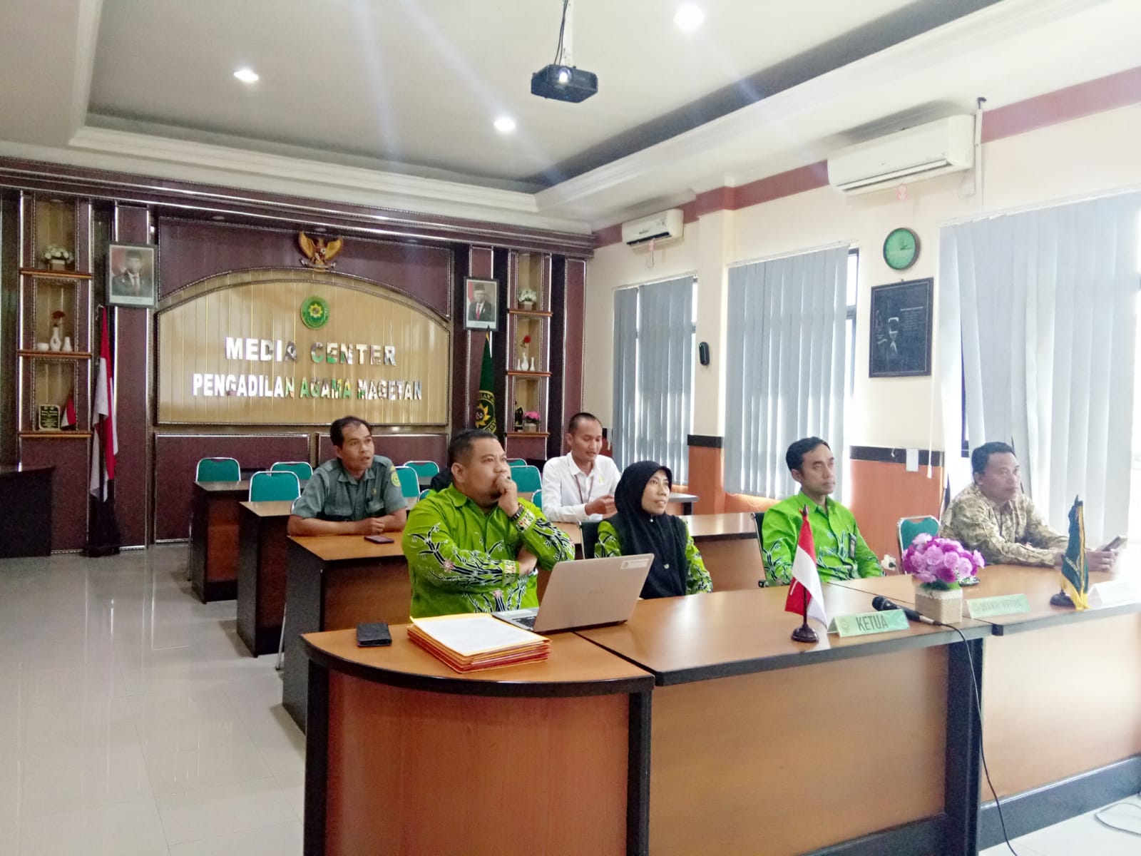 Magetan | pa-magetan.go.id | Segenap Pimpinan, Hakim, dan karyawan Pengadilan Agama Magetan mengikuti Acara Penerima Anugerah Mahkamah Agung Tahun 2022 dan Duta Peradilan Tahun 2022 secara daring di Media Center Kantor Pengadilan Agama Magetan. (19/8/2022).