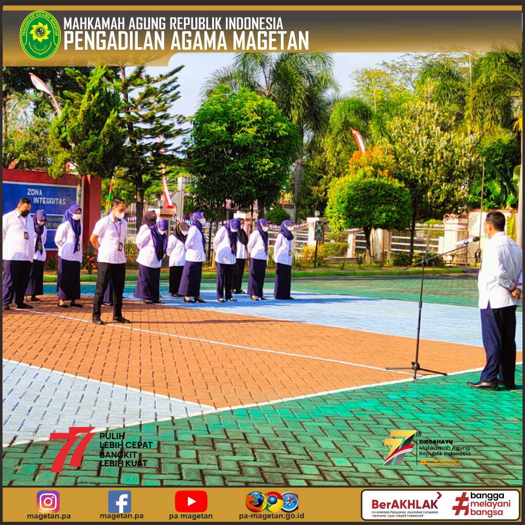 Magetan | pa-magetan.go.id | Pengadilan Agama Magetan melaksanakan kegiatan Apel Senin pagi, Apel kali ini dipimpin oleh Paniteran Pengadilan Agama Magetan (Drs. Mat Busiril, M.H). Dalam arahannya beliau menyampaikan ucapan syukur alhamdulillah atas kegiatan-kegiatan yang telah kita laksanakan dan alhamdulillah kita dapat memperoleh penghargaan keterbukaan informasi dari Mahkamah Agung RI pada tahun ini.