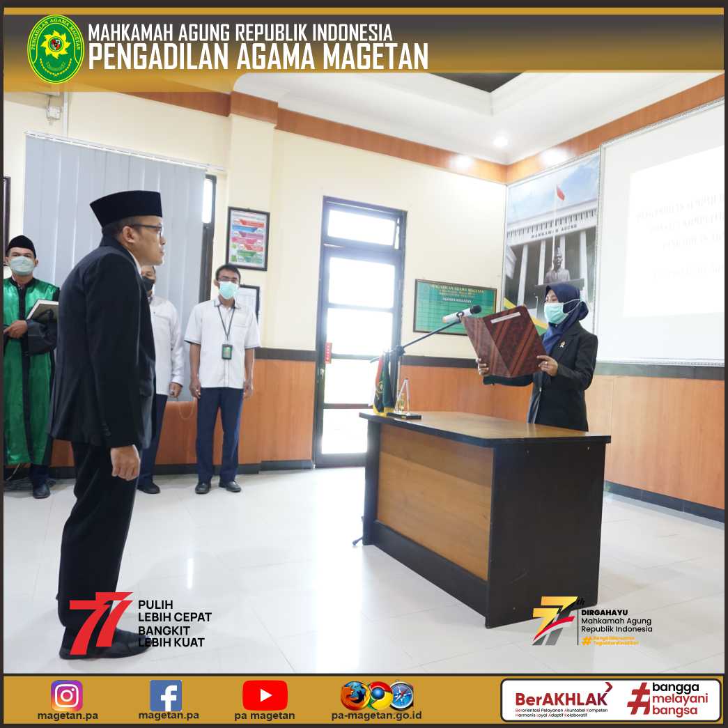 Magetan | pa-magetan.go.id | Ketua Pengadilan Agama Magetan, YM. Eny Rianing Taro, S.Ag., M.Sy melantik dan mengambil sumpah Pranata Komputer Pengadilan Agama Magetan. Bertempat diruang pertemuan Pengadilan Agama Magetan, pelantikan dan pengambilan sumpah ini dihadiri oleh Panitera, Sekretaris dan pegawai Pengadilan Agama Magetan. Khamid Beny Santoso, S.Kom yang sebelumnya merupakan PNS di Pengadilan Agama Magetan, berdasarkan Surat Keputusan Sekretaris Mahkamah Agung RI No. 1004/ SEK/ Kp.I/ SK/ VIII/ 2022 tertanggal 1 Agustus 2022 resmi dilantik menjadi Pranata Komputer.