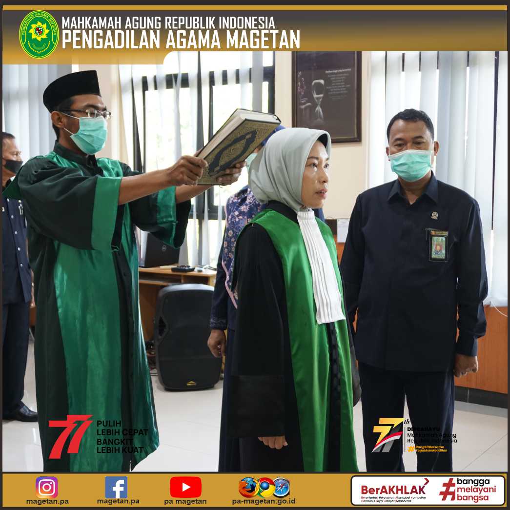 Magetan | pa-magetan.go.id | Ketua Pengadilan Agama Magetan (Eny Rianing Taro, S.Ag., M.Sy) melantik Wakil Ketua Pengadilan Agama Magetan (Wakhidah, S.H, S.H.I, M.H). Acara Pengambilan Sumpah Jabatan dan Pelantikan Wakil Ketua Pengadilan Agama Magetan ini dilaksanakan di Media Center Pengadilan Agama Magetan.
