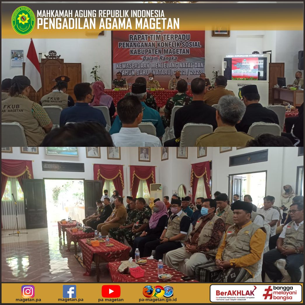 Magetan | pa-magetan.go.id | Pengadilan Agama Magetan yang diwakili oleh Ketua (YM. Hj. Yurita Heldayanti, S.Ag., M.H) menghadiri Rapat Tim Terpadu Penanganan Konflik Sosial Kabupaten Magetan Dalam Rangka Kewaspadaan Menjelang Natal dan Tahun Baru (Nataru) 2022/ 2023 yang dilaksanakan di Kantor Bupati Magetan.