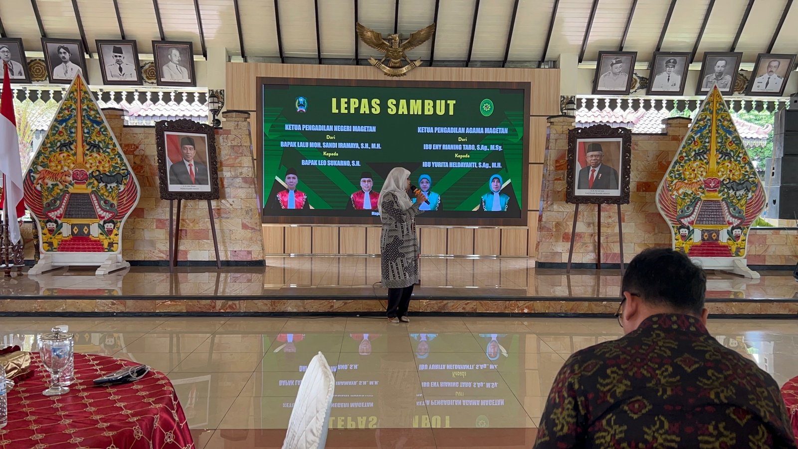 Magetan | pa-magetan.go.id | Pemerintah Daerah Kabupaten Magetan menggelar acara Lepas Sambut Ketua Pengadilan Negeri Magetan dan Ketua Pengadilan Agama Magetan, Jumat 23 Desember 2022. Acara ini dilaksanakan menyusul Promosi dan Mutasi Ketua Pengadilan Negeri Magetan Kelas II (YM. Lalu Moh. Sandi Iramaya, SH., MH) menjadi Hakim Pengadilan Negeri Mataram Kelas 1A, dan sebagai pengganti beliau adalah YM. Leo Sukarno, SH.