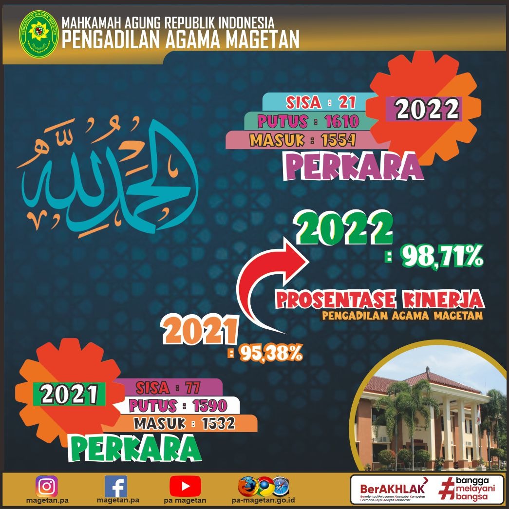 Prosentase Kinerja yang terus meningkat disetiap tahunnya, merupakan suatu kebanggaan yang dapat diraih dengan kerjasama, komunikasi dan ikhtiar dari seluruh aparatur Pengadilan Agama Magetan. Alhamdulillah sisa perkara di Tahun 2022 ini tinggal 21 perkara, hal itu dapat terwujud karena kerja keras dan pelaksanaan instruksi dari Pimpinan dalam mencapai target sisa perkara di Tahun 2022 ini. Perkara yang masuk di Tahun 2022 ini mencapai 1554 perkara, dan yang berhasil putus sebesar 1610 perkara dengan jenis perkara yang berbeda-beda yang menjadi kompetensi Pengadilan Agama.