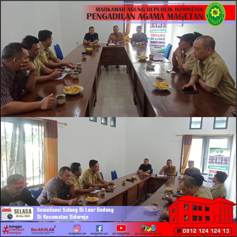 Kegiatan yang diikuti oleh Bapak Camat Sidorejo dan para perangkat desa se Kecamatan Sidorejo ini merupakan sosialisasi sidang pengadilan yang dilaksanakan di luar gedung pengadilan yang di peruntukan bagi masyarakat yang mengalami hambatan untuk datang ke kantor pengadilan karena alasan jarak, transportasi dan biaya. Diharapkan dengan sosialisasi ini dapat diteruskan kepada warga masyarakat sekitar yang hendak memanfaatkan kedatangan Pengadilan Agama Magetan, sehingga pelayanan kepada para pencari keadilan dapat tersampaikan dengan baik dan berjalan lancar.