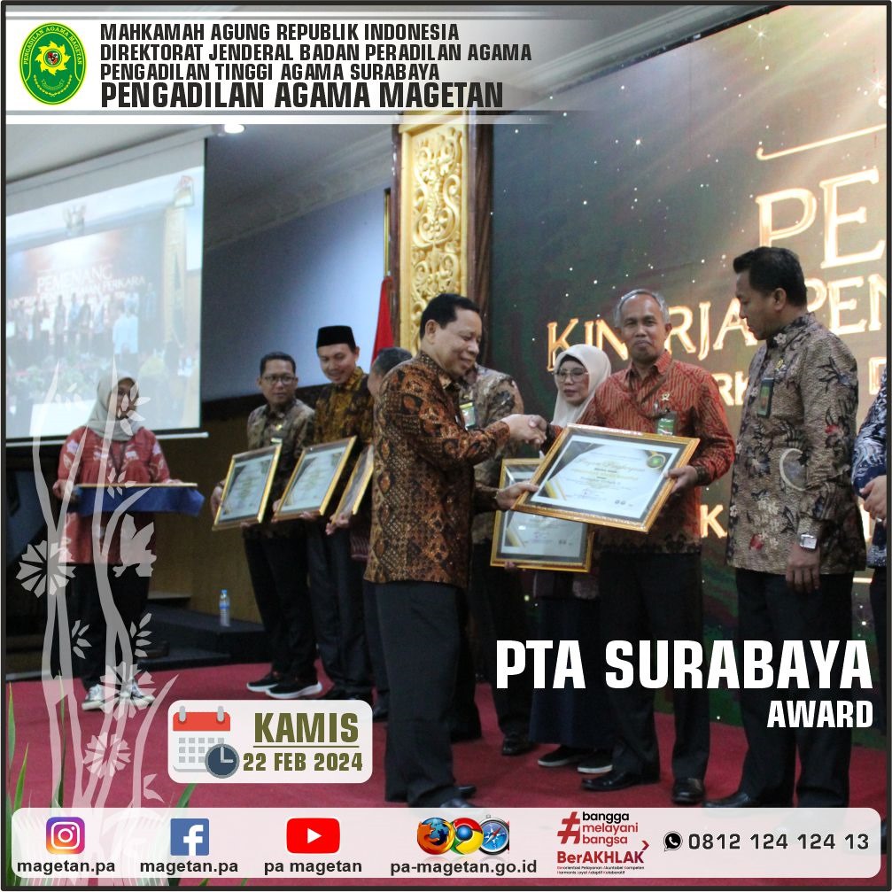 Selanjutnya, pada Kamis (22/02/2024) Malam dilaksanakan kegiatan penganugerahan PTA Surabaya Award. PTA Surabaya Award ini bertujuan untuk mengapresiasi kinerja satuan kerja di wilayah PTA Surabaya yang dibagi menjadi beberapa nominasi. Pada PTA Surabaya Award kali ini, Pengadilan Agama Magetan mendapat Peringkat Terbaik II dalam bidang Kinerja Penyelesaian Perkara untuk kategori satuan kerja dengan Jumlah 1.001 s.d. 2.500 Perkara.