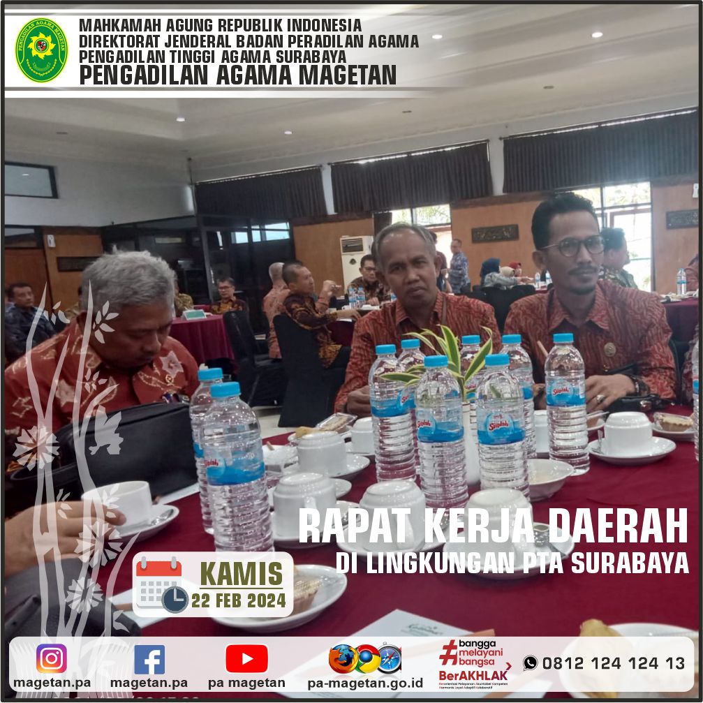 Magetan | pa-magetan.go.id | Ketua, Panitera, Sekretaris mengikuti acara Rapat Kerja Daerah dan PTA Surabaya Award yang diadakan oleh Pengadilan Tinggi Agama Surabaya pada hari Rabu s.d. Jumat (21-23 Februari 2024). Kegiatan ini sebagai tindak lanjut Undangan PTA Surabaya nomor 687/KPTA.W13-A/HM1.1.1/1/2024 tanggal 30 Januari 2024. Pelaksanaan Rakerda ini diikuti oleh seluruh Hakim Tinggi Pengadilan Tinggi Agama Surabaya, para Ketua, Panitera, dan Sekretaris Pengadilan Agama seWilayah PTA Surabaya, serta pejabat Struktural dan Fungsional PTA Surabaya bertempat di Kusuma Agrowisata Resort dan Convention Hotel. Rapat Kerja Daerah dan PTA Surabaya Award kali ini mengambil tema "Tingkatkan Integritas untuk Kinerja yang Berkualitas".