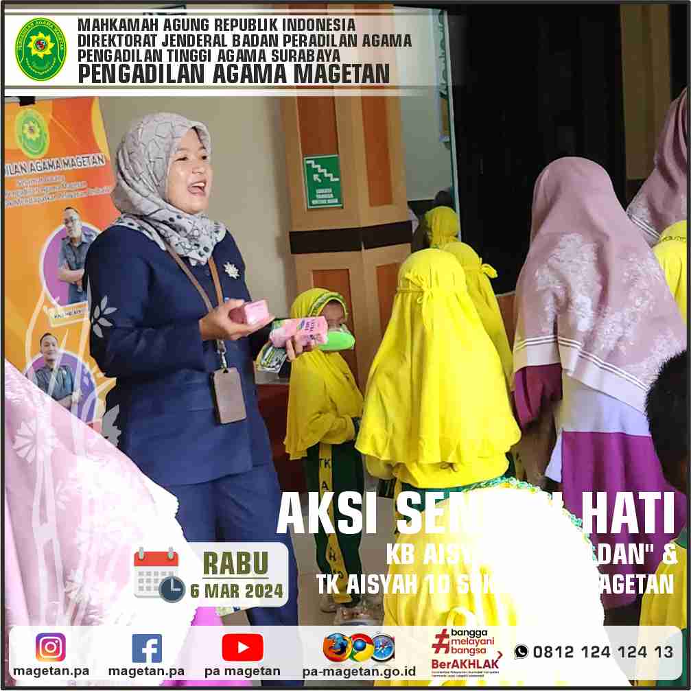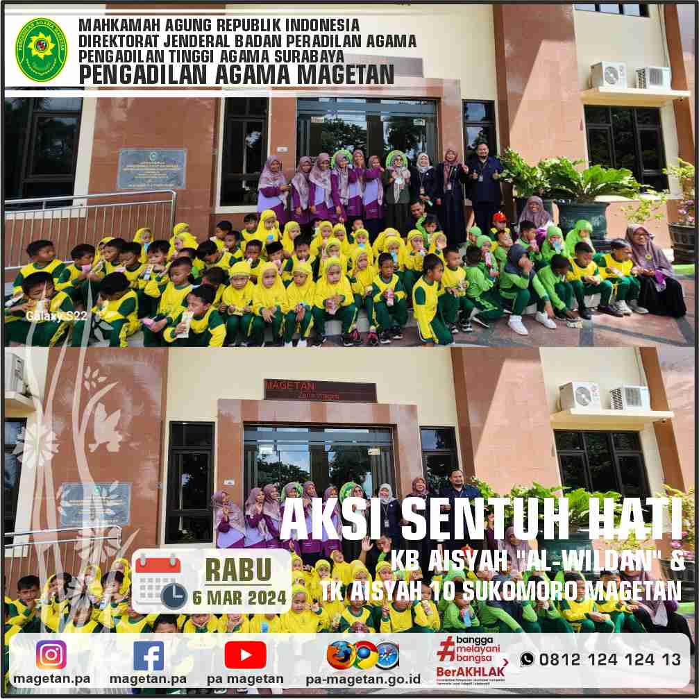 Kegiatan Aksi Sentuh Hati ini merupakan agenda rutin dari KB Aisyah "Al Wildan" dan TK Aisyah 10 Sukomoro. Menjelang datangnya bulan Ramdhan setiap tahun KB Aisyah "Al Wildan" dan TK Aisyah 10 Sukomoro senantiasa melakukan kunjungan ke beberapa Instansi di Kecamatan Sukomoro dan Sekitarnya, termasuk salah satunya Pengadilan Agama Magetan. Terimakasih atas kunjungannya, semoga Kegiatan ini membawa manfaat bagi semua.